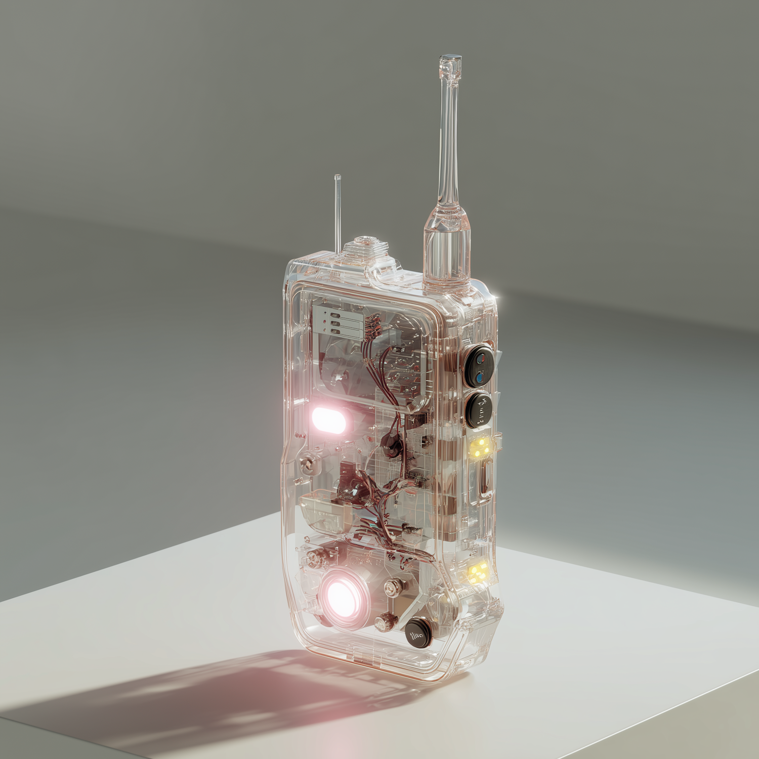 Transparent retro-style gadget with visible circuits and glowing lights, showcasing a futuristic design on a minimalistic surface.