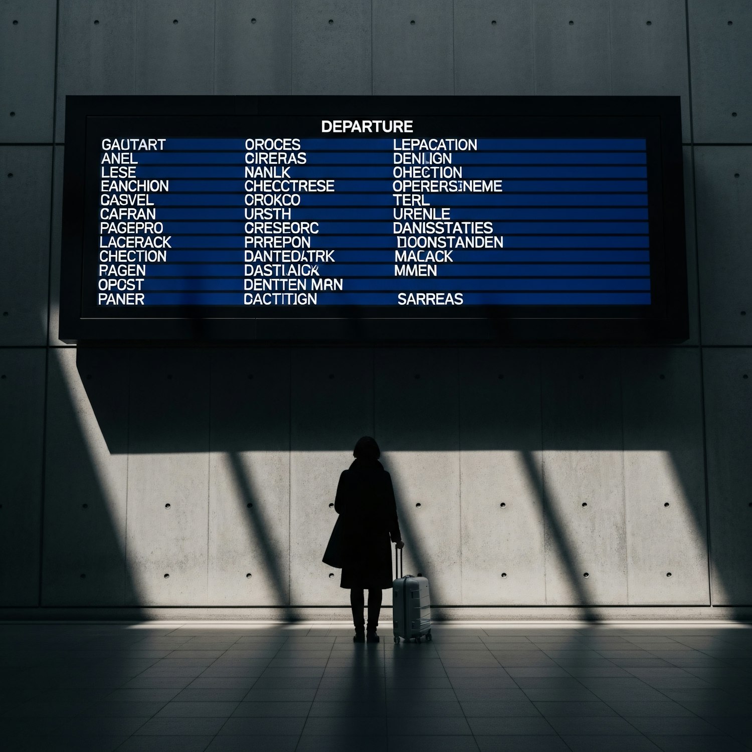 Silhouetted traveler with suitcase gazing at a departure board in a modern station, bathed in dramatic light and shadows.