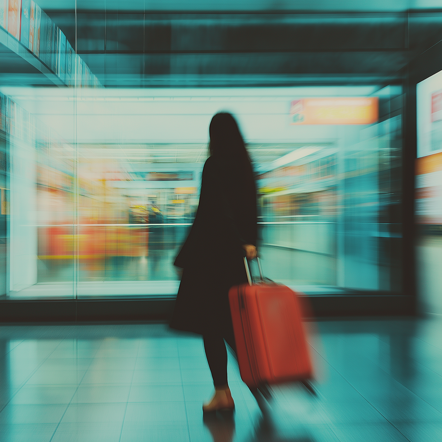 Blurred image of a person with a red suitcase in a modern transit area, evoking a sense of movement and travel.