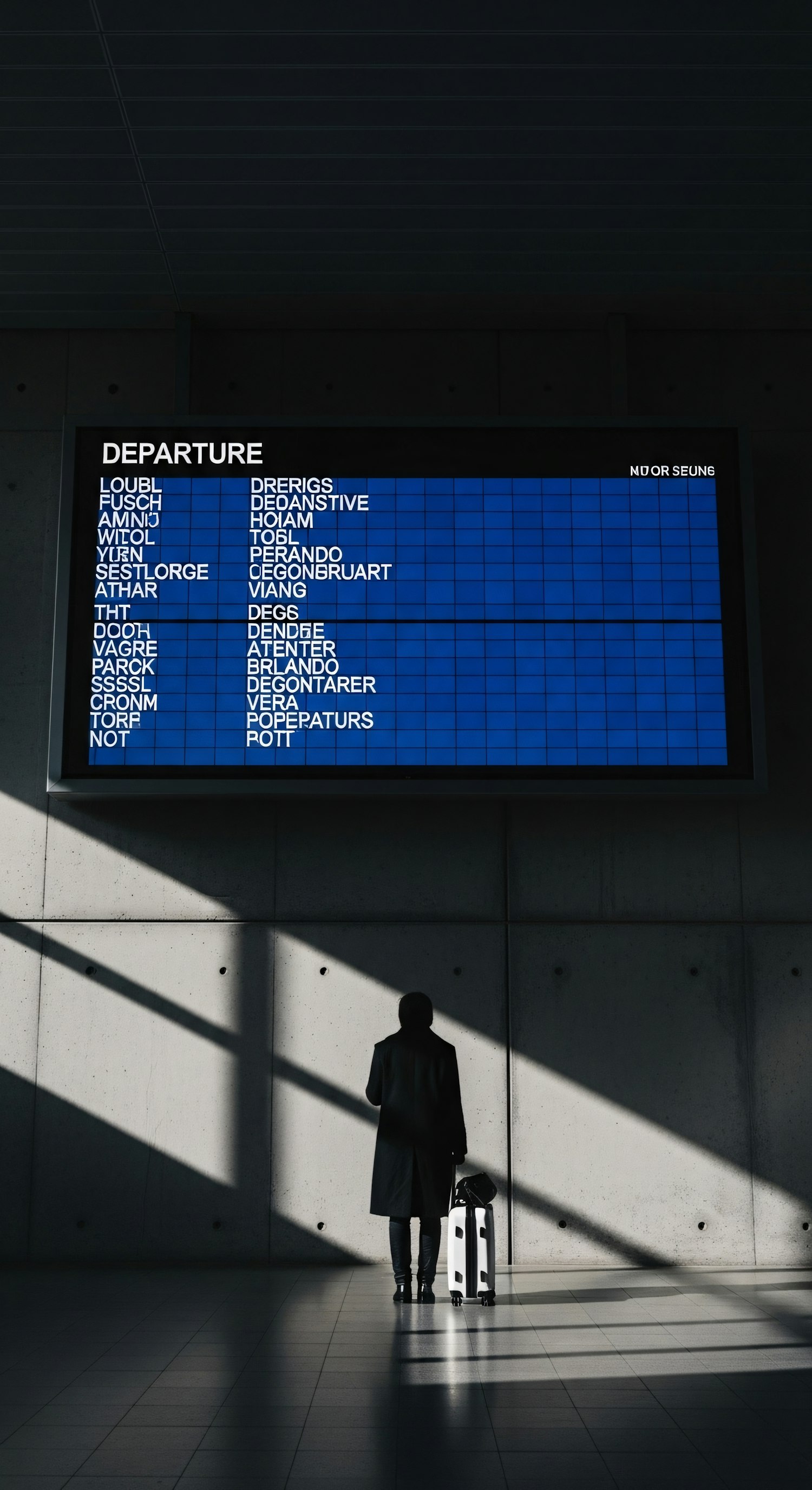 A traveler in a modern terminal stands before a blue departure board, holding a white suitcase. Dramatic shadows fill the minimalist space.