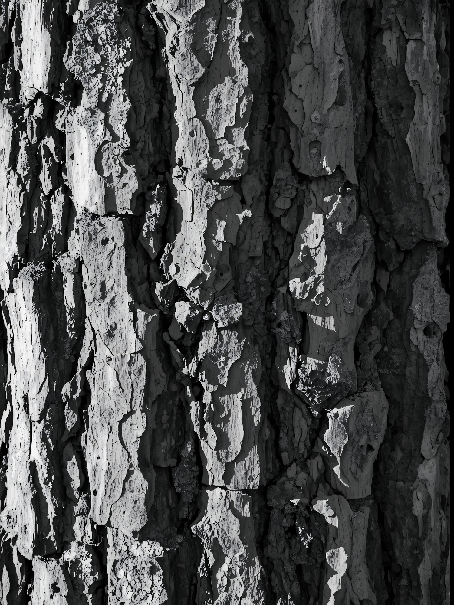 Close-up of a tree's bark in monochrome, highlighting its rugged texture and intricate patterns with dramatic light and shadow.