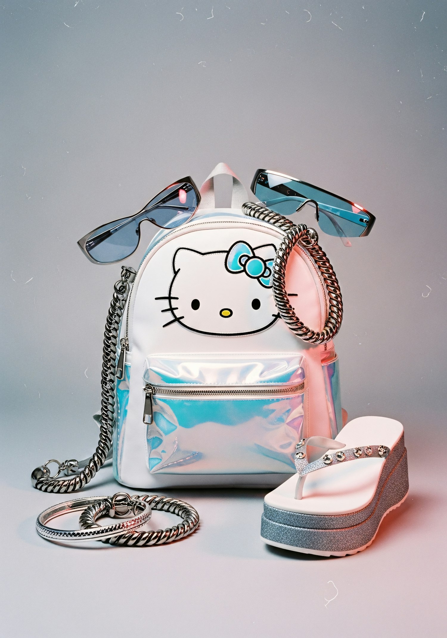 A chic Hello Kitty backpack with iridescent details, paired with stylish sunglasses, silver accessories, and platform sandals.