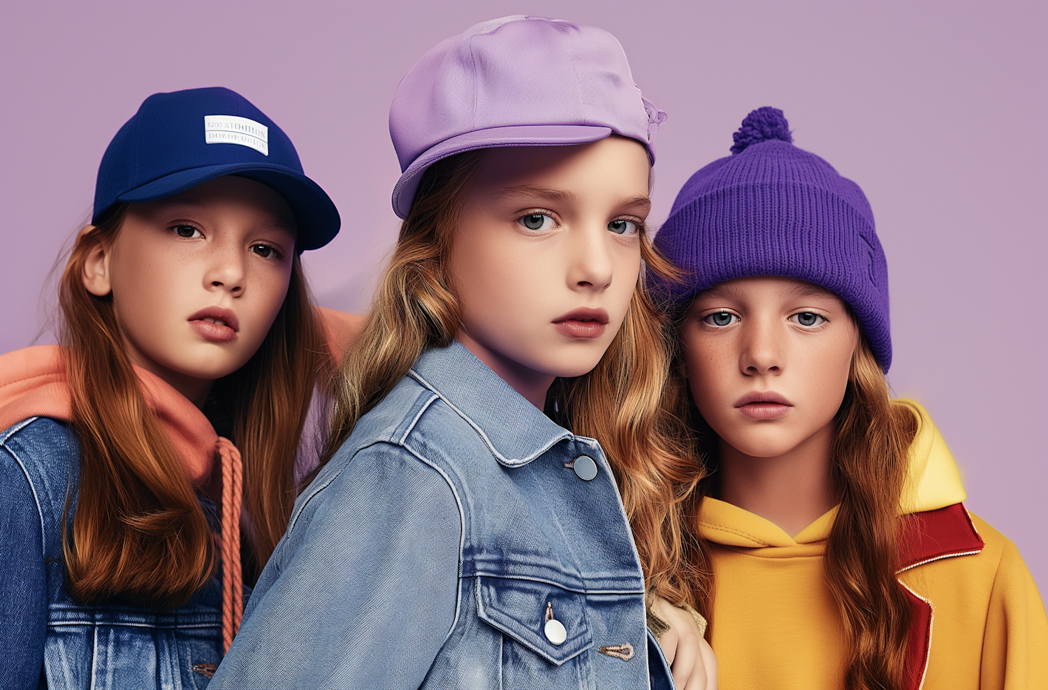 Three stylish girls in colorful hats and casual outfits pose against a lavender background, showcasing trendy denim and vibrant hoodies.