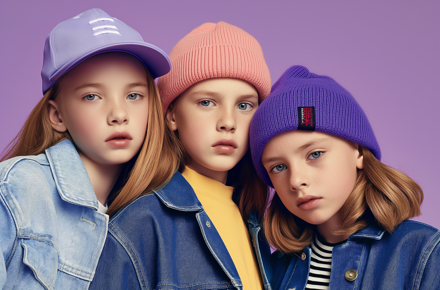 Three stylish young girls in trendy hats and denim jackets pose against a purple background, showcasing casual fashion vibes.