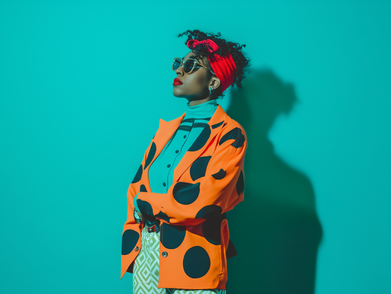 Stylish woman in vibrant outfit with polka dot jacket and red headband against a turquoise background.