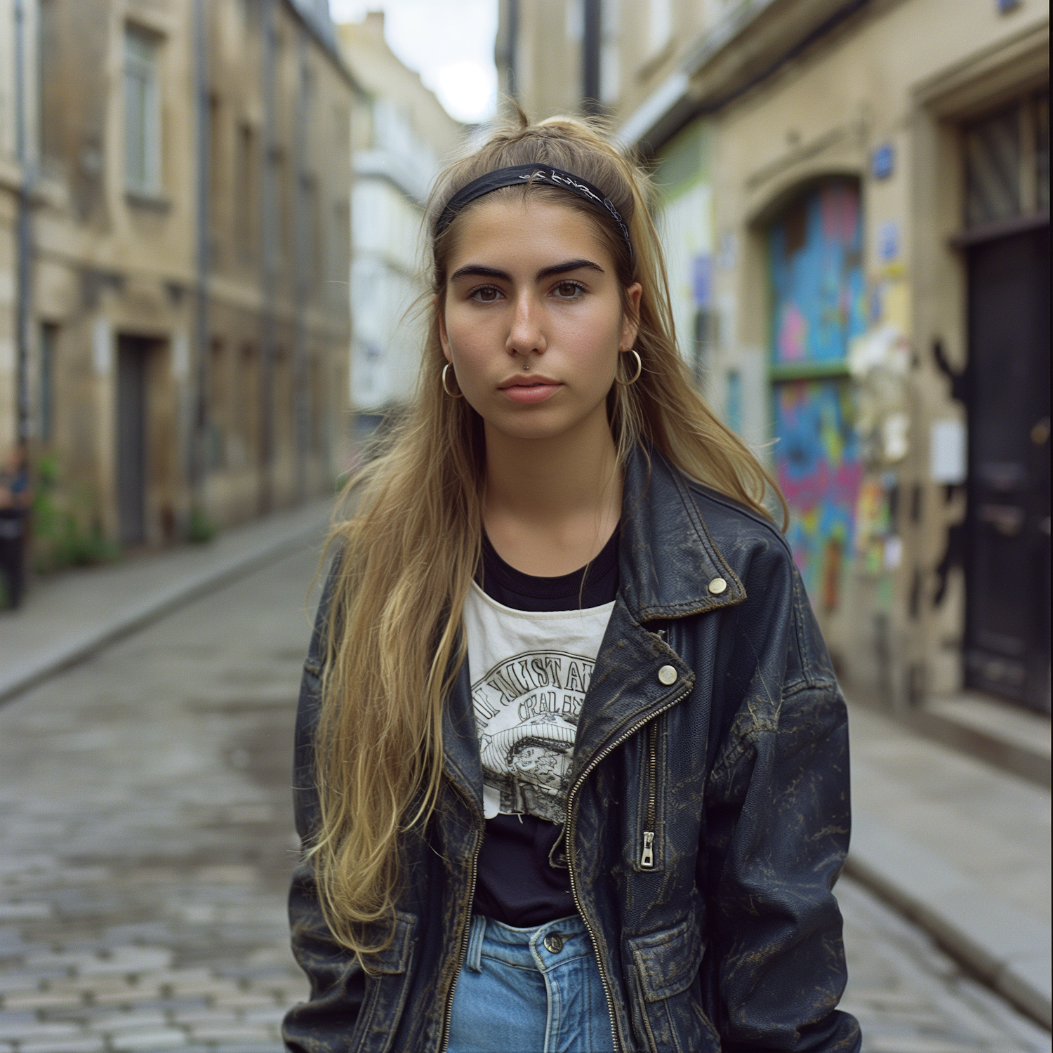 Young woman with blonde hair in a leather jacket stands in a cobblestone street, exuding a confident, edgy style.