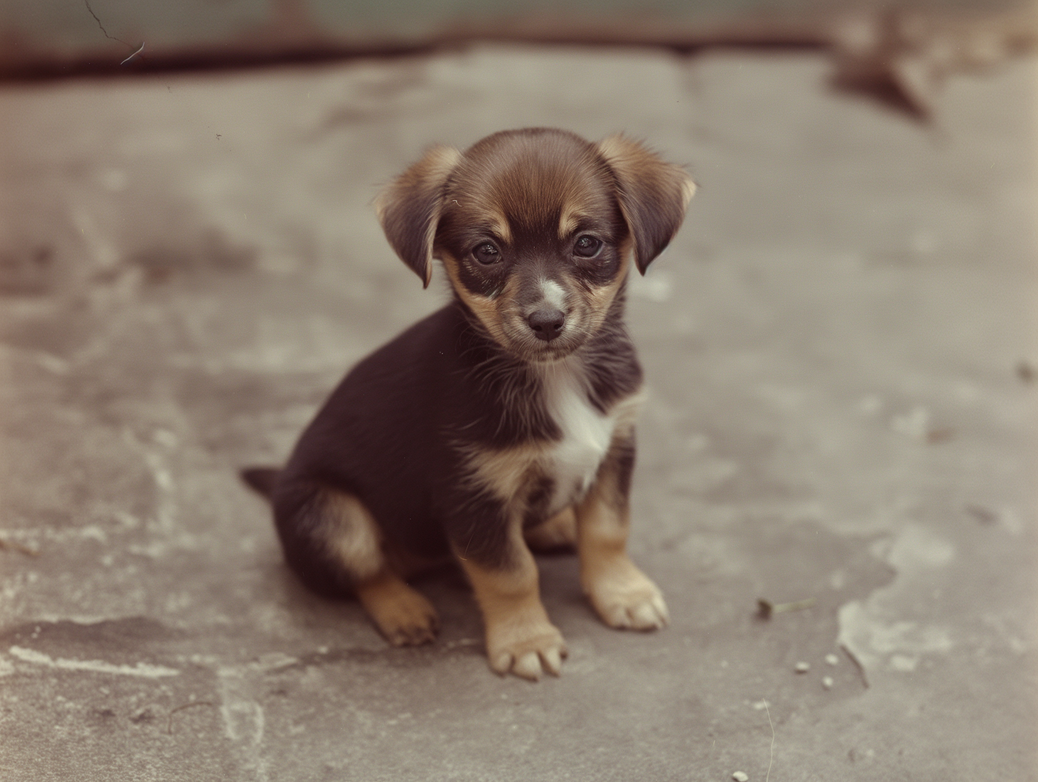Adorable puppy with black, brown, and white fur sitting on a concrete floor, looking curiously at the camera.