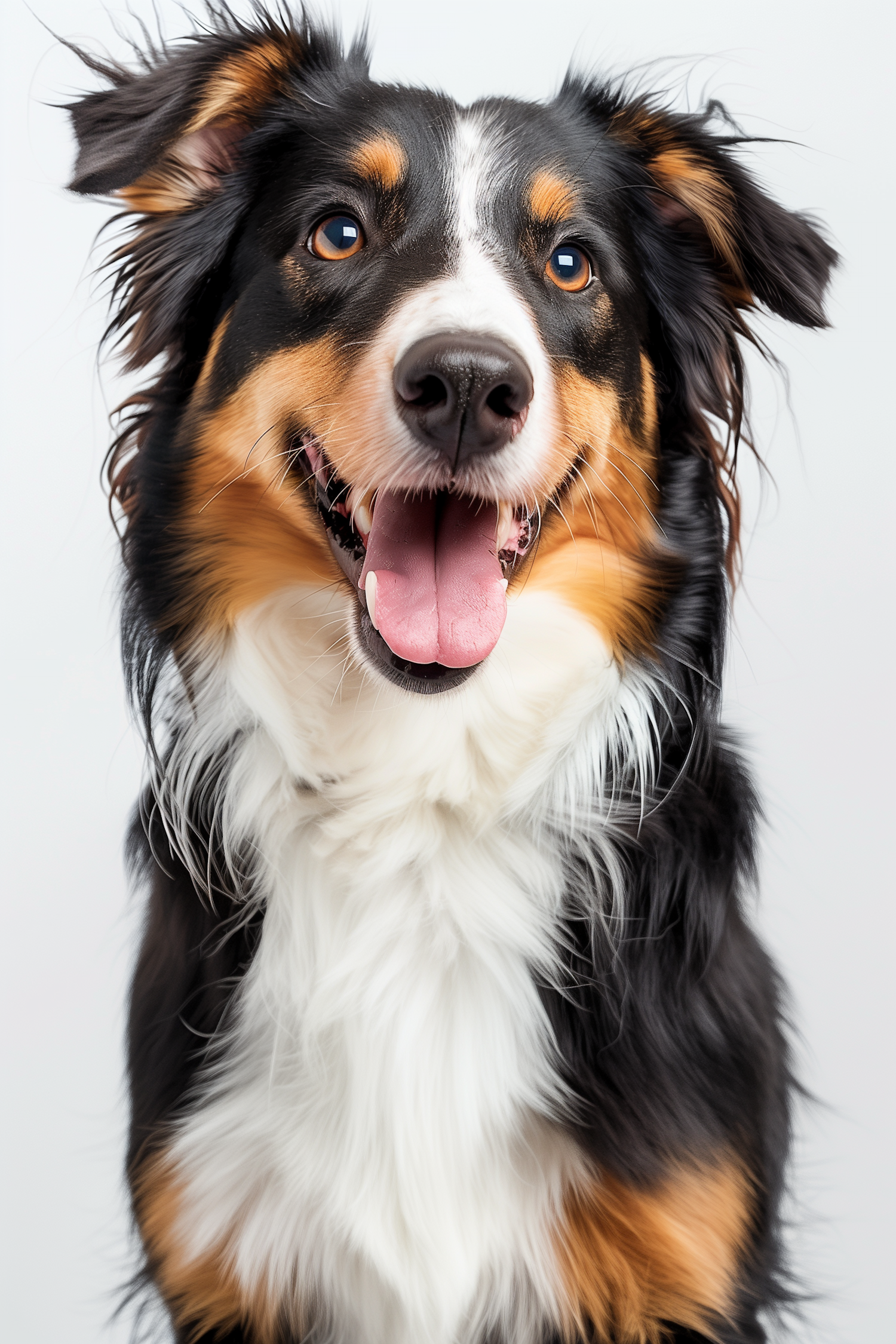 Happy tri-color dog with fluffy coat and bright eyes against a white background, exuding joy and friendliness.