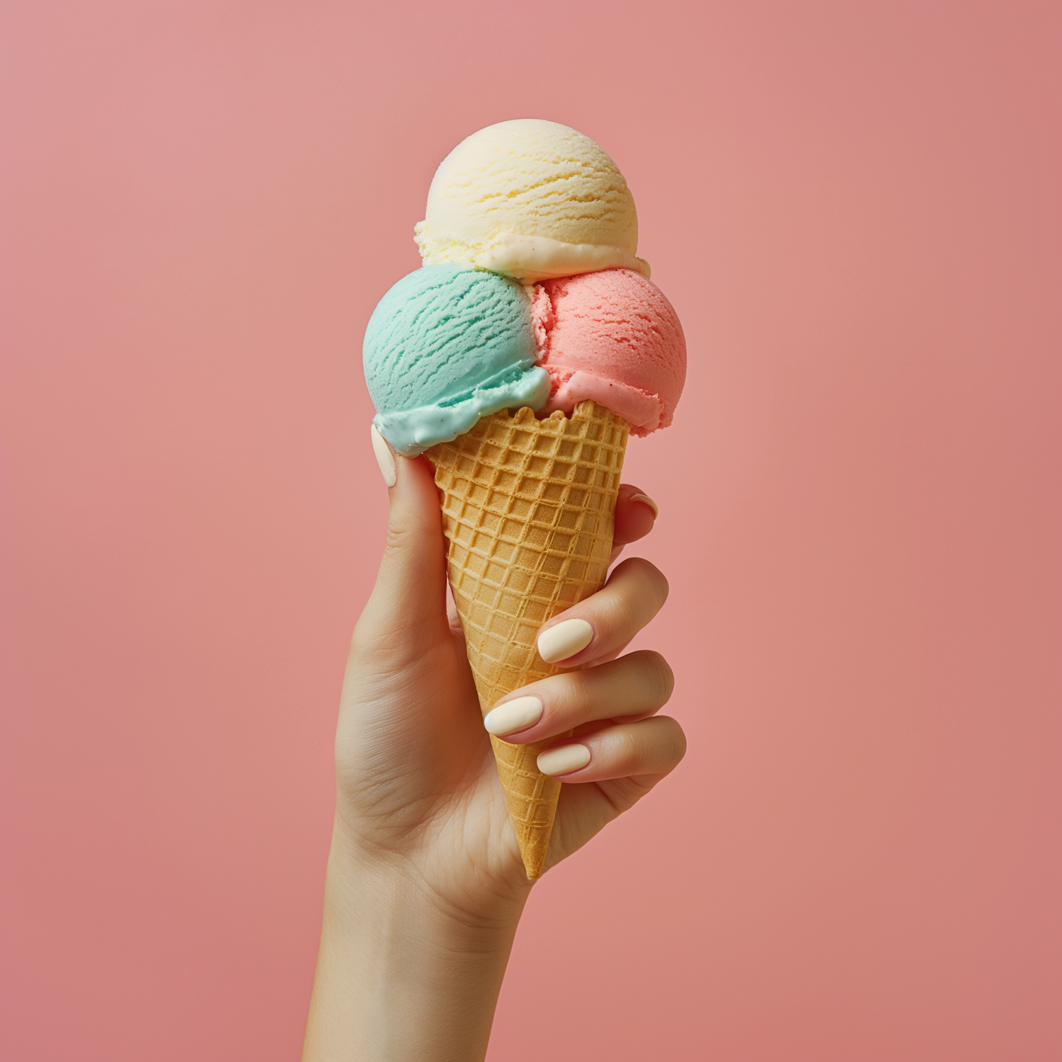Hand holding a waffle cone with pastel ice cream scoops against a pink background. Vibrant and colorful dessert scene.