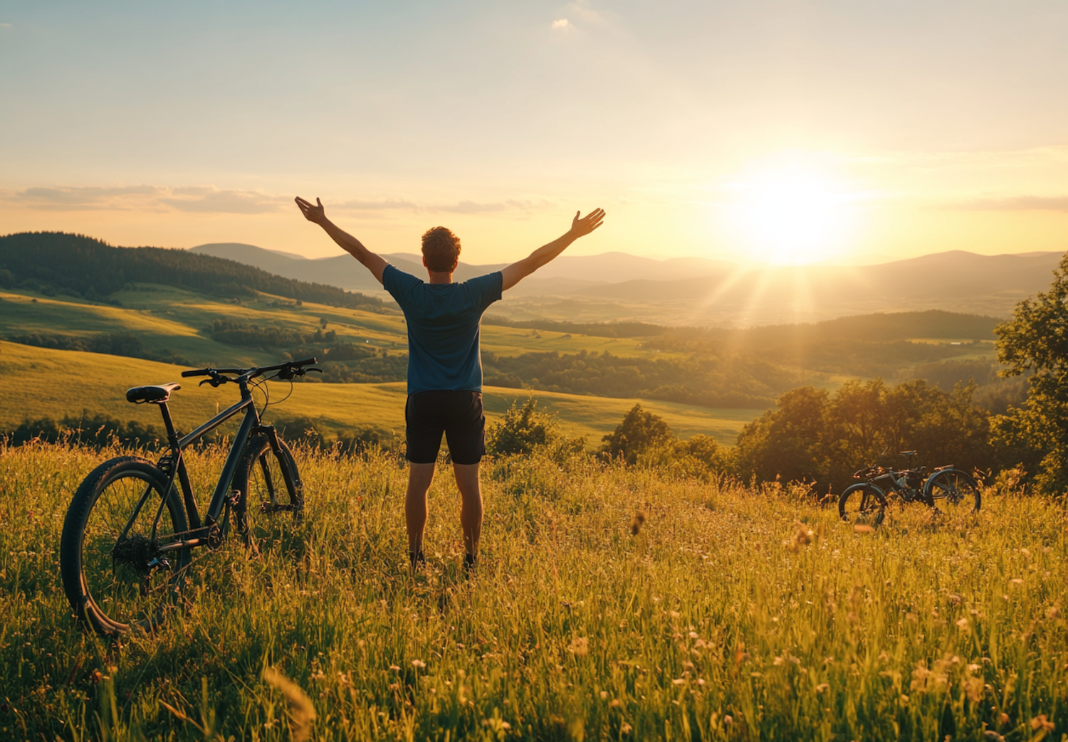 Man with bicycle on hilltop at sunset, arms outstretched, enjoying scenic view of rolling hills and golden sky.