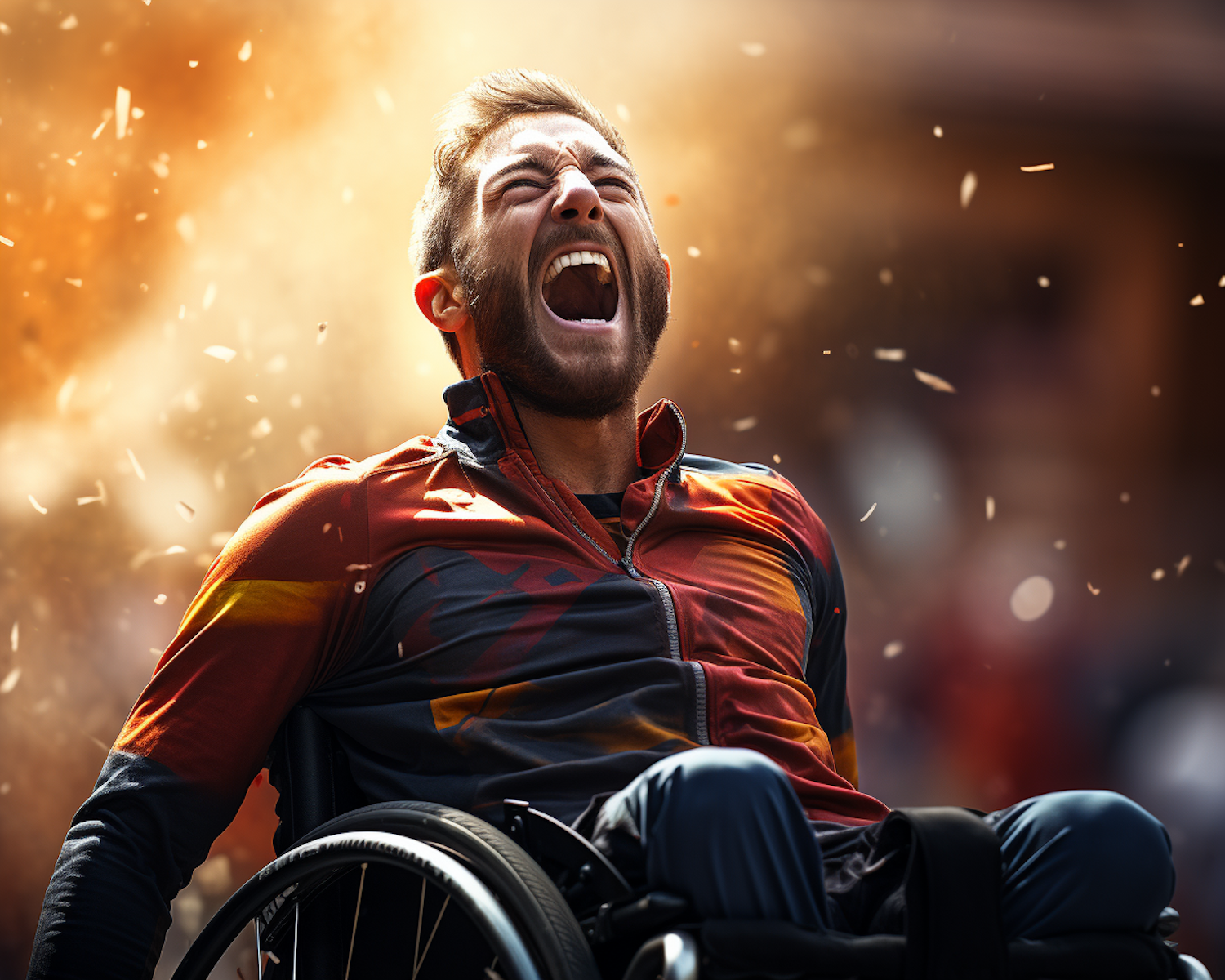 Triumphant man in a wheelchair celebrating passionately, wearing a vibrant athletic jacket with sparks flying in a golden background.
