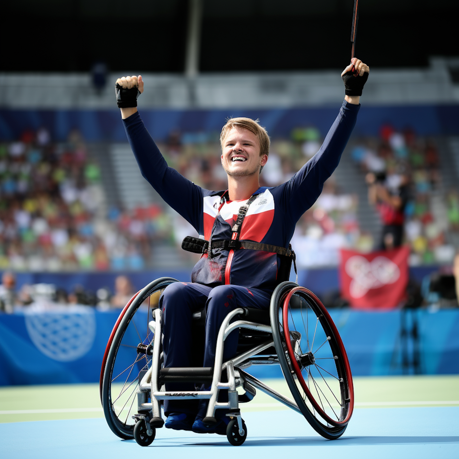 Paralympic athlete celebrates victory on the court, raising arms in triumph with a joyful expression. Vibrant stadium crowd in the background.