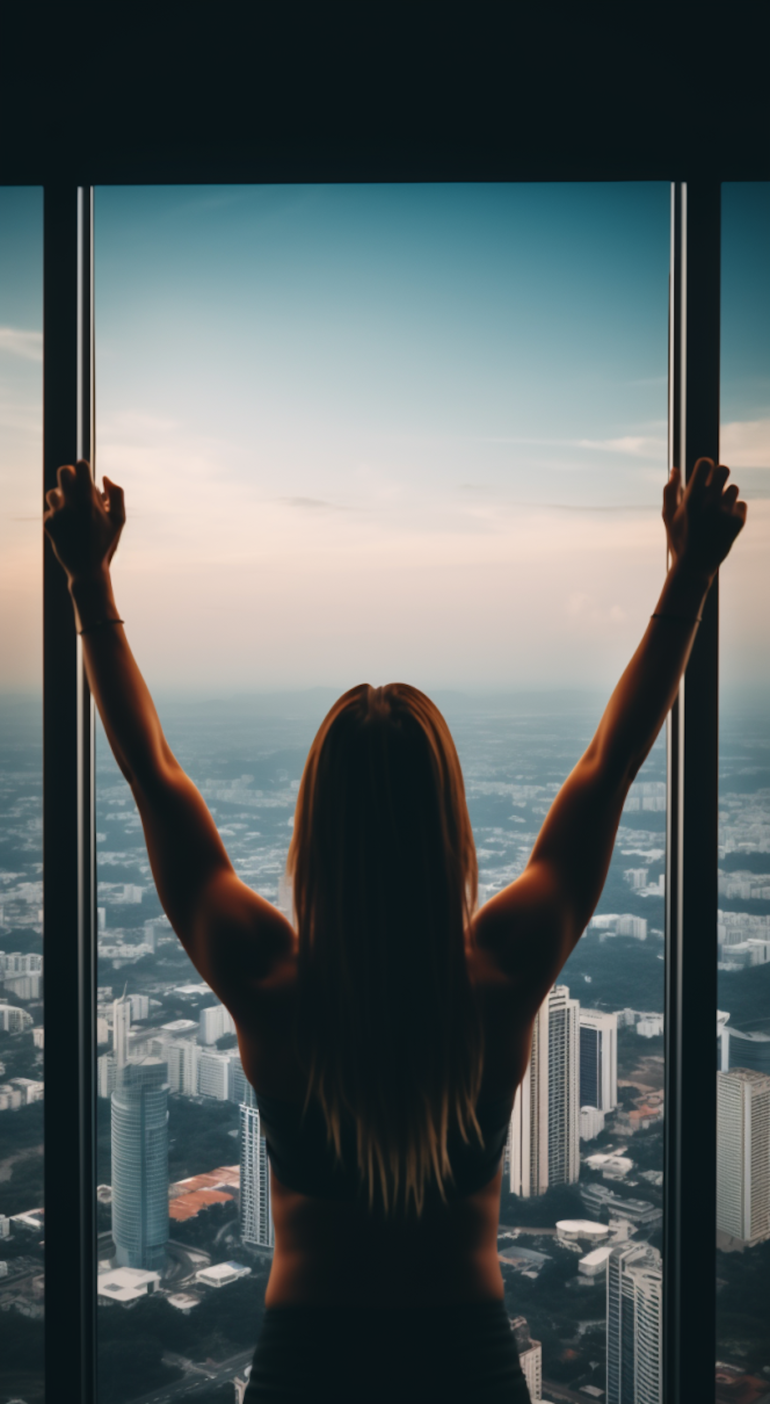 Woman with arms raised, overlooking cityscape through large window at sunrise or sunset, conveying freedom and empowerment.