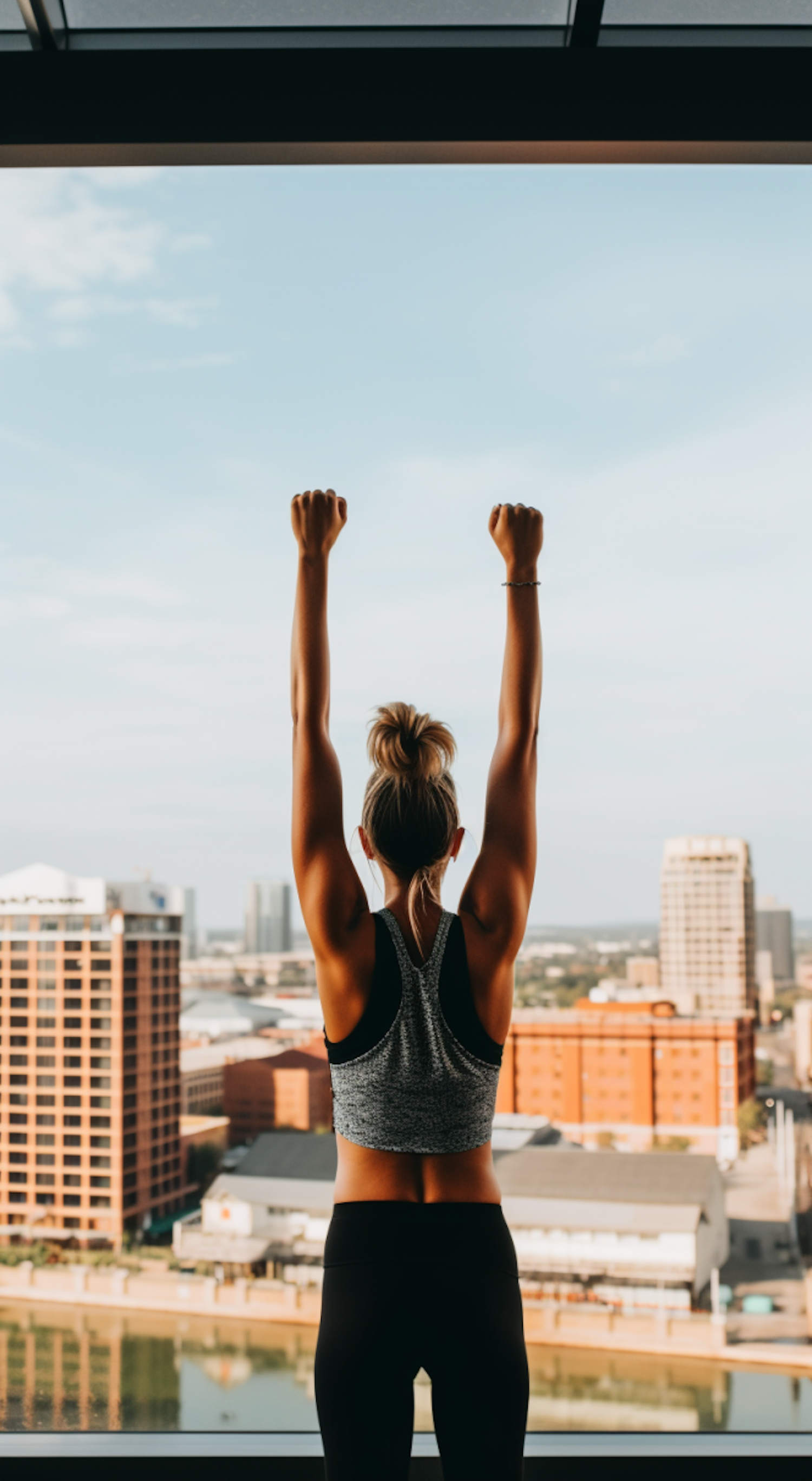 Woman in sportswear raises arms triumphantly, overlooking cityscape through large window. Empowerment and achievement theme.