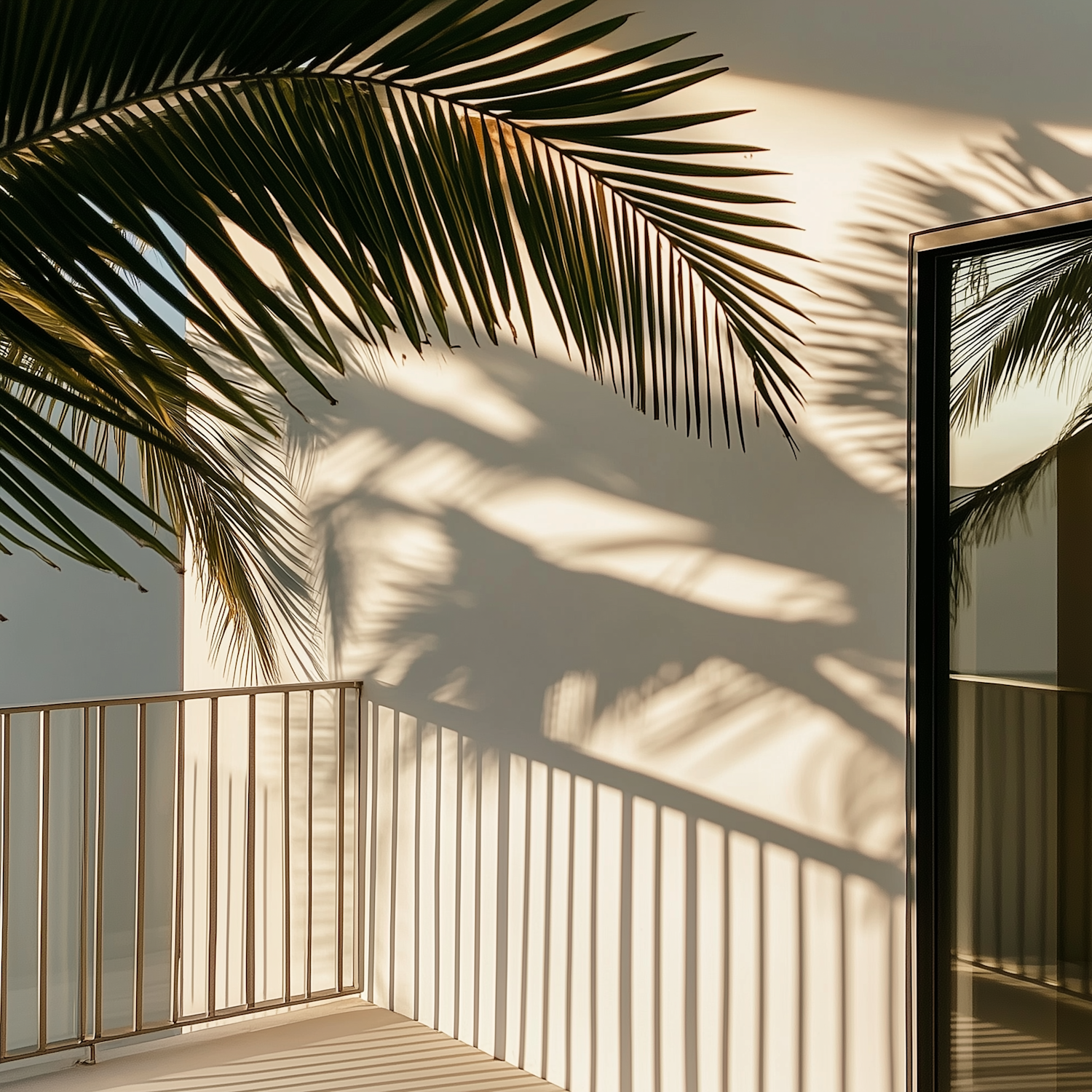 Minimalist balcony with palm frond shadows on a cream wall, sleek metal railing, and a glass door reflecting tropical light.