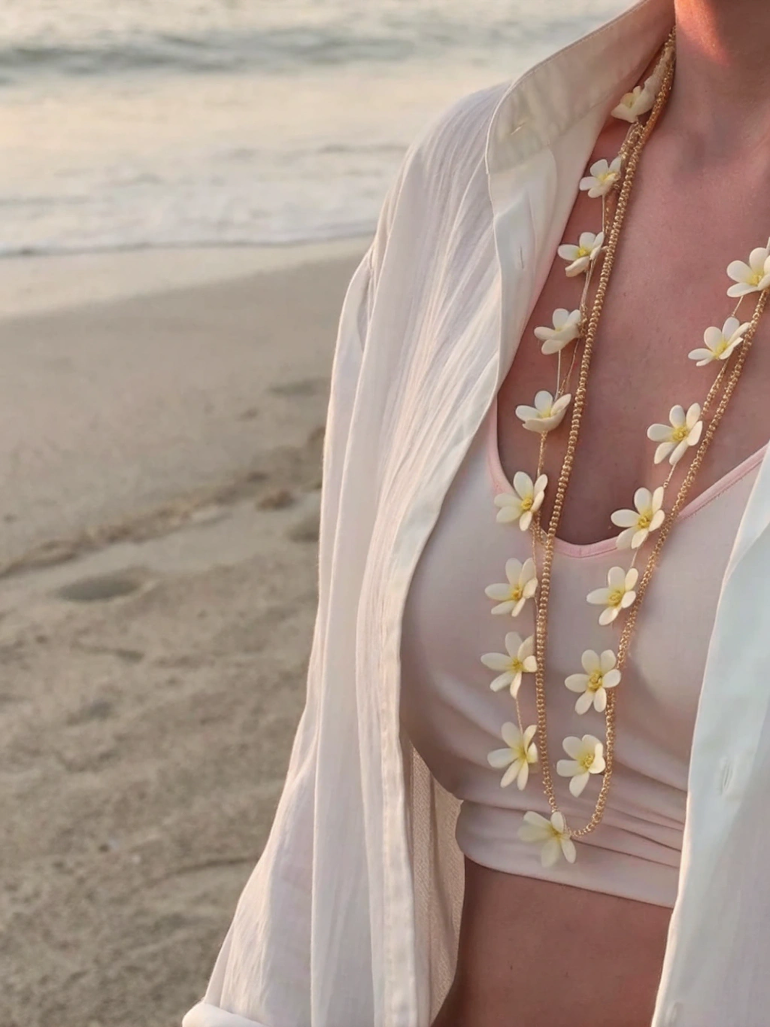 Close-up of a floral necklace over a pink crop top and white shirt, set against a serene beach at sunset.