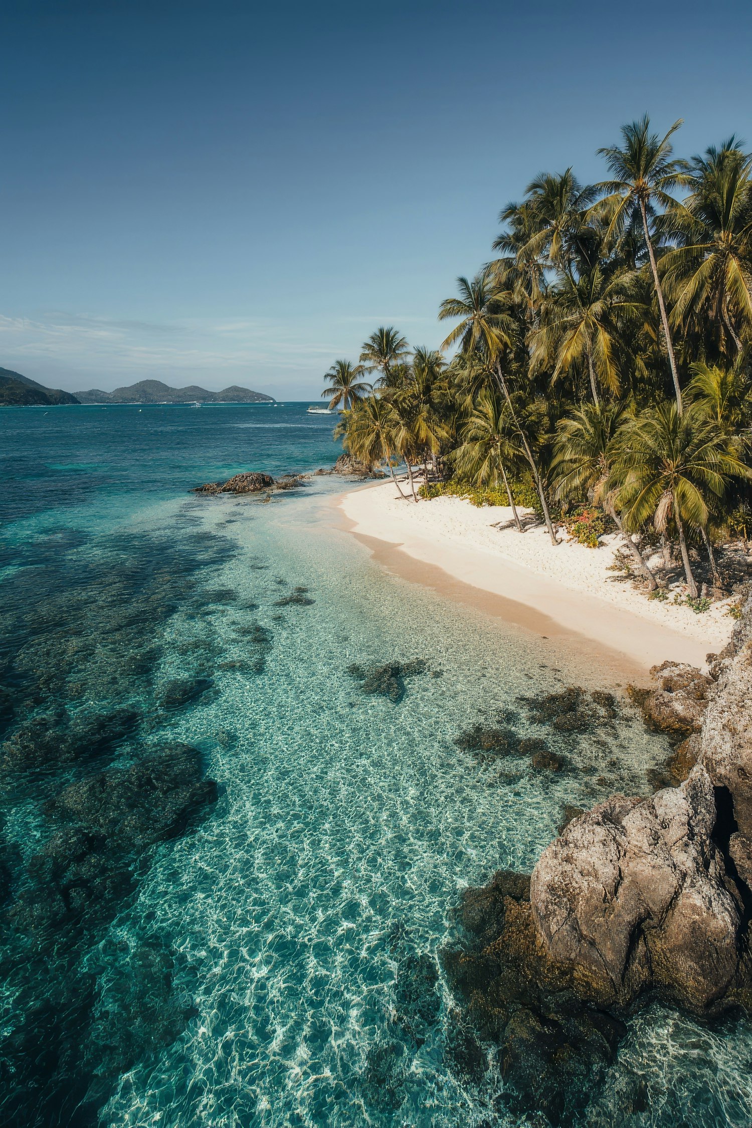Crystal-clear turquoise waters meet a sandy beach lined with lush palm trees, creating a serene tropical paradise.
