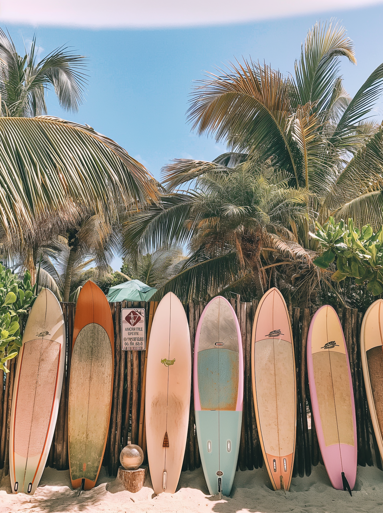 Colorful surfboards lined up against a wooden fence with lush palm trees and a bright blue sky in the background.