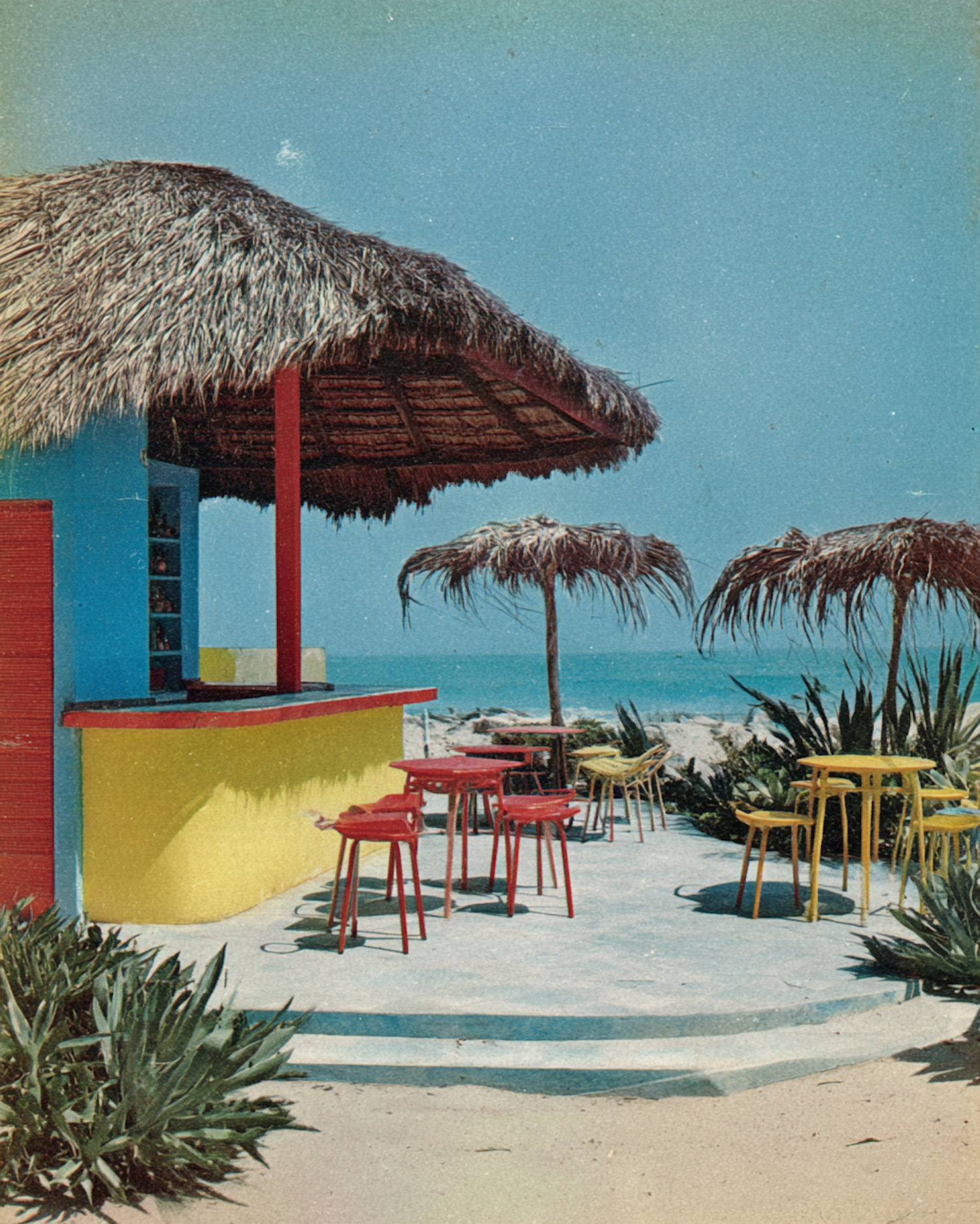 Colorful beachside bar with thatched roof, vibrant red and yellow furniture, and a tropical ocean backdrop. Perfect vacation vibes!