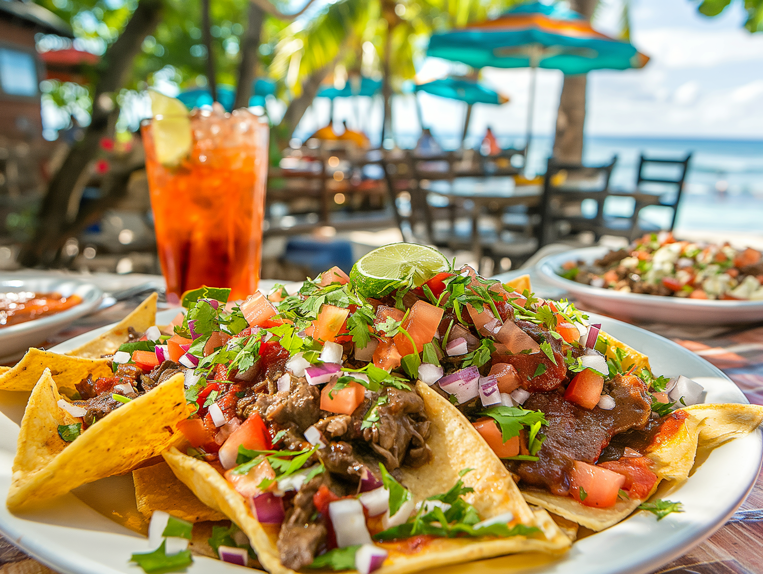 Delicious nachos topped with fresh veggies and beef, set in a vibrant beachside restaurant scene with iced tea.