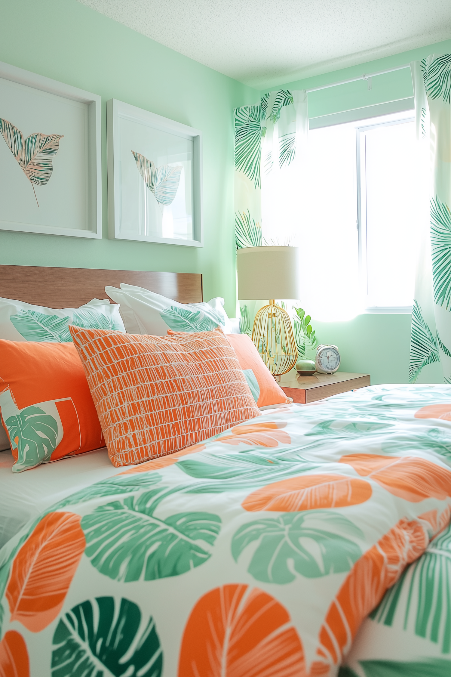Bright tropical-themed bedroom with mint green walls, palm leaf decor, and vibrant orange and green bedding for a fresh, summery vibe.