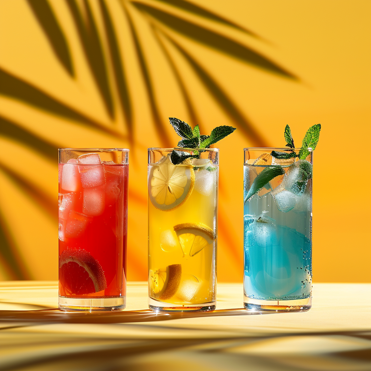 Three vibrant drinks with ice and mint against a yellow background, featuring red, yellow, and blue hues with citrus garnishes.