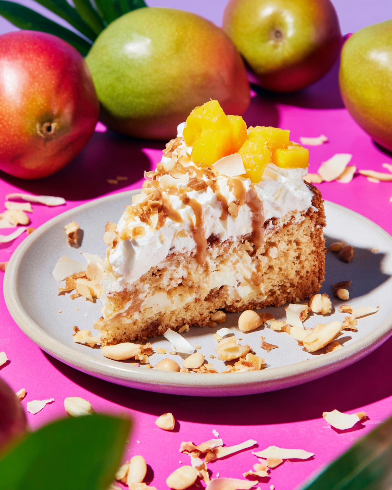 A vibrant slice of tropical cake with mangoes, whipped cream, and caramel drizzle, surrounded by fresh fruits and nuts on a pink background.