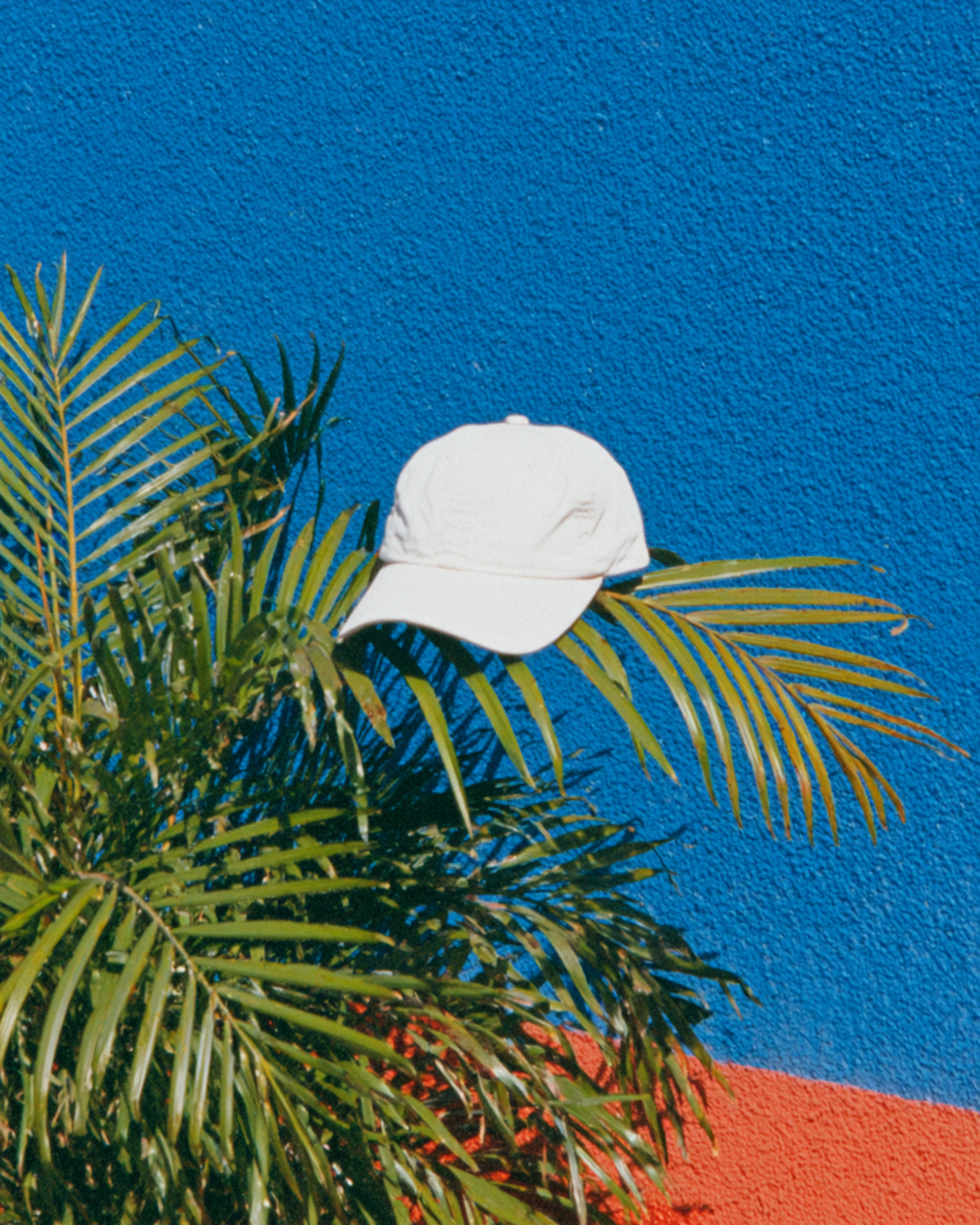 A white cap rests on green palm leaves against a vibrant blue and red wall, creating a playful and tropical aesthetic.
