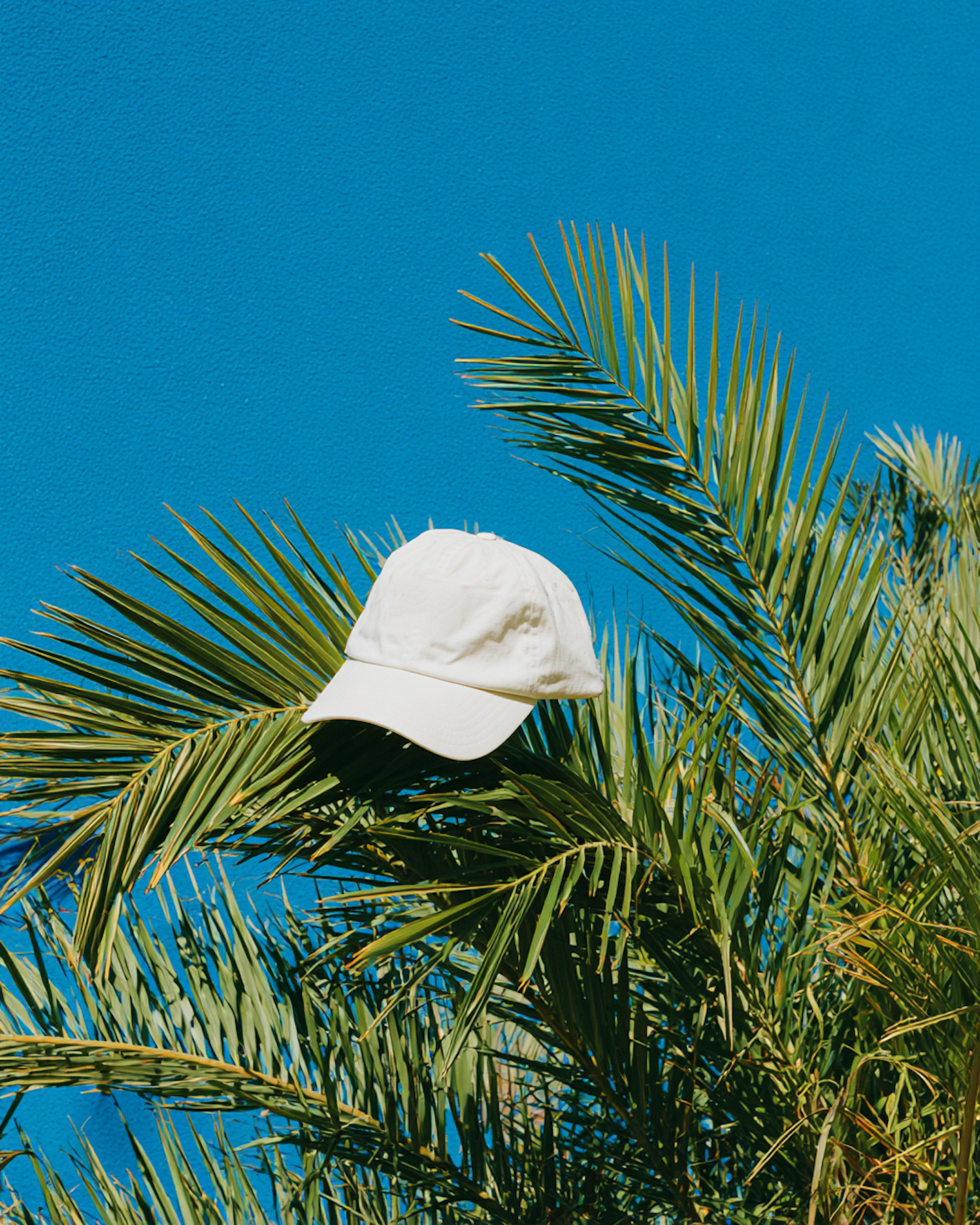 A white cap resting on green palm fronds against a bright blue background, creating a vibrant and tropical aesthetic.