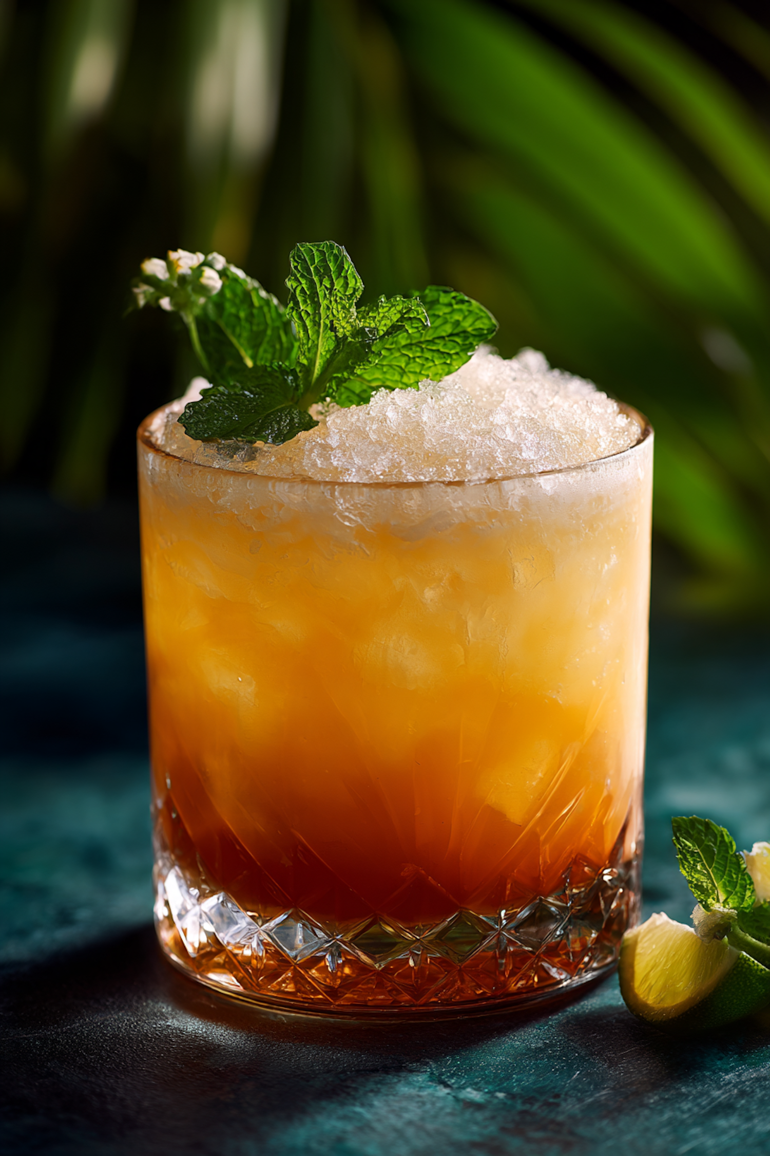 Refreshing tropical cocktail with crushed ice, mint garnish, and a vibrant orange-to-amber gradient, perfect for summer vibes.