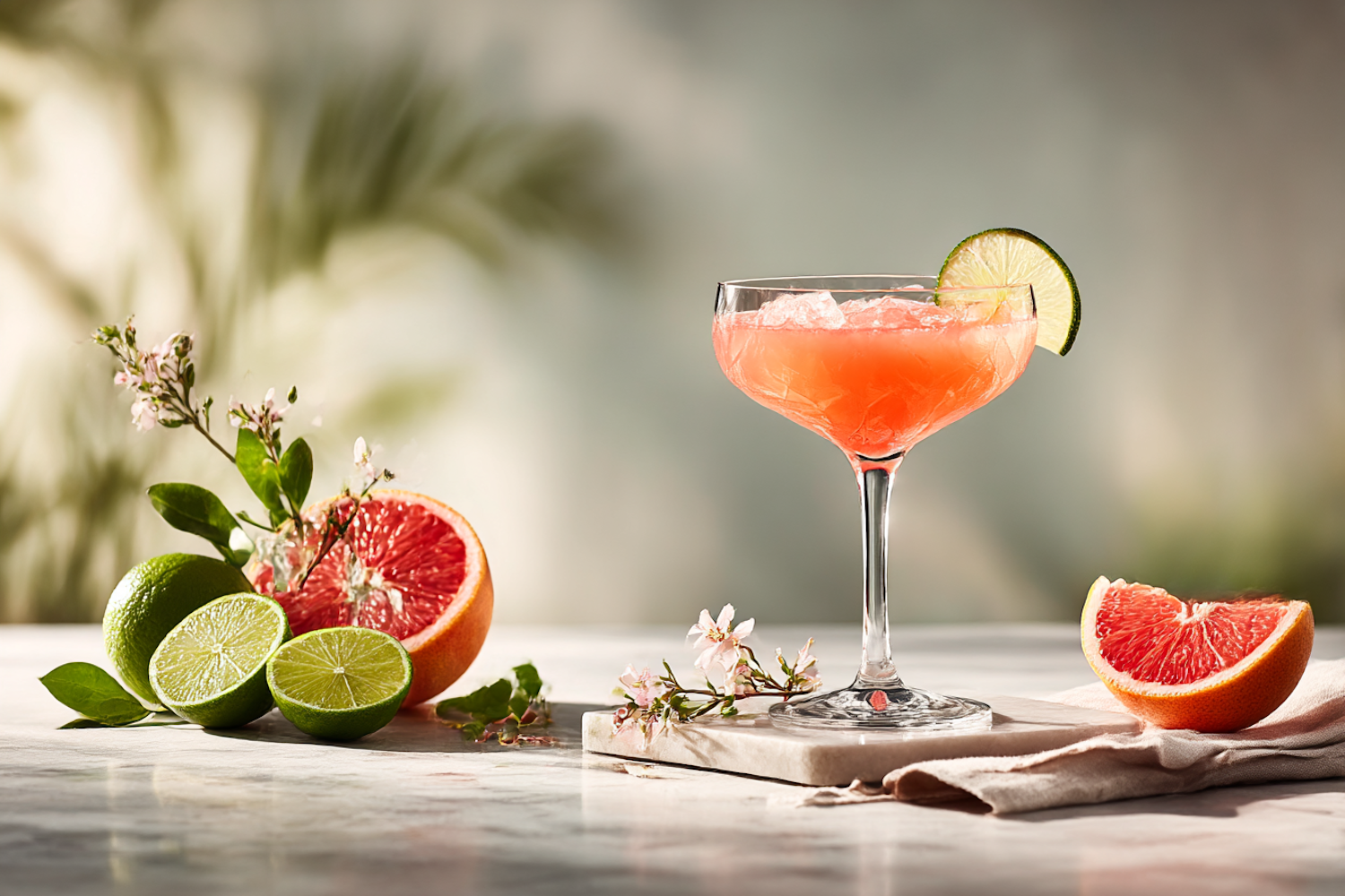 A refreshing pink cocktail with lime garnish, surrounded by fresh citrus fruits and flowers on a marble surface, perfect for summer vibes.