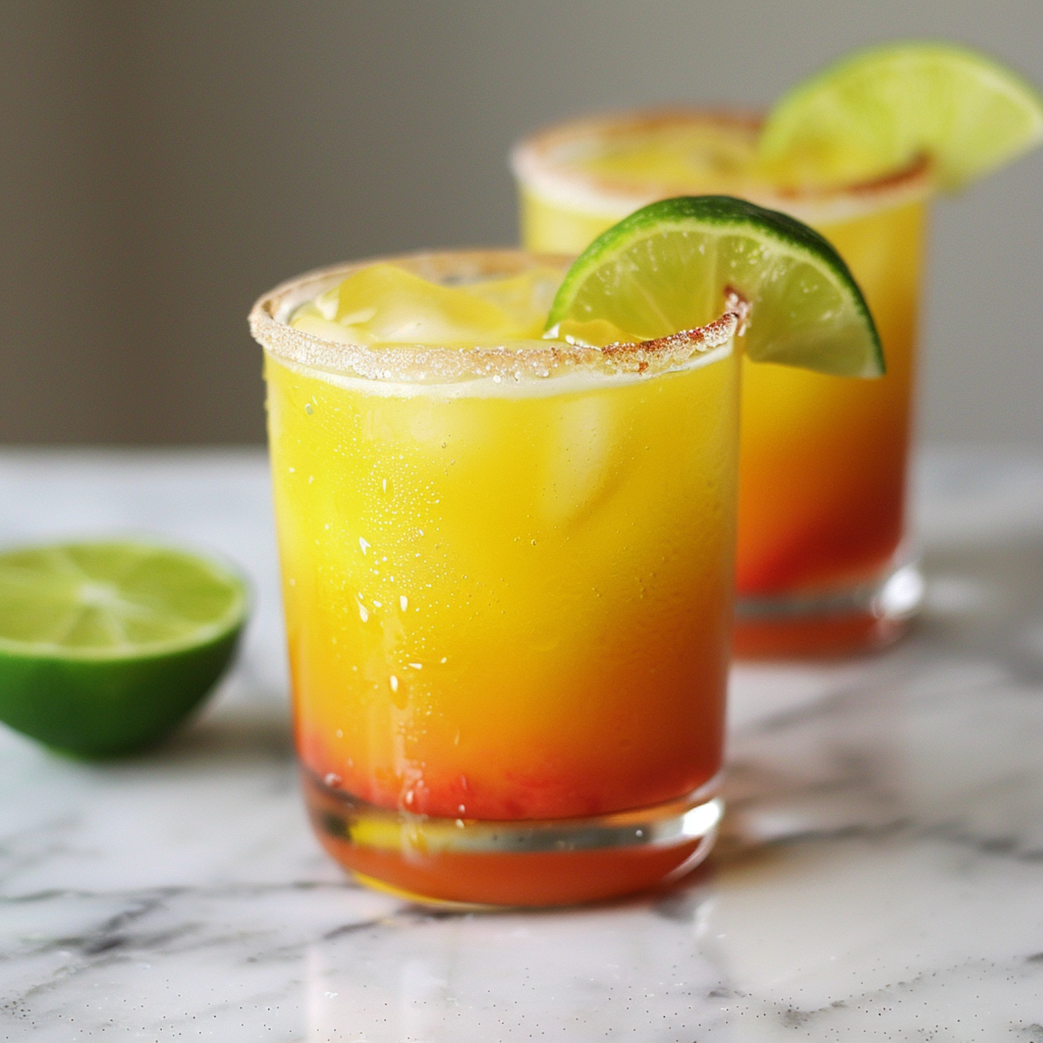 Colorful cocktails with lime wedges and sugared rims on a marble surface, featuring a vibrant red-to-yellow gradient.