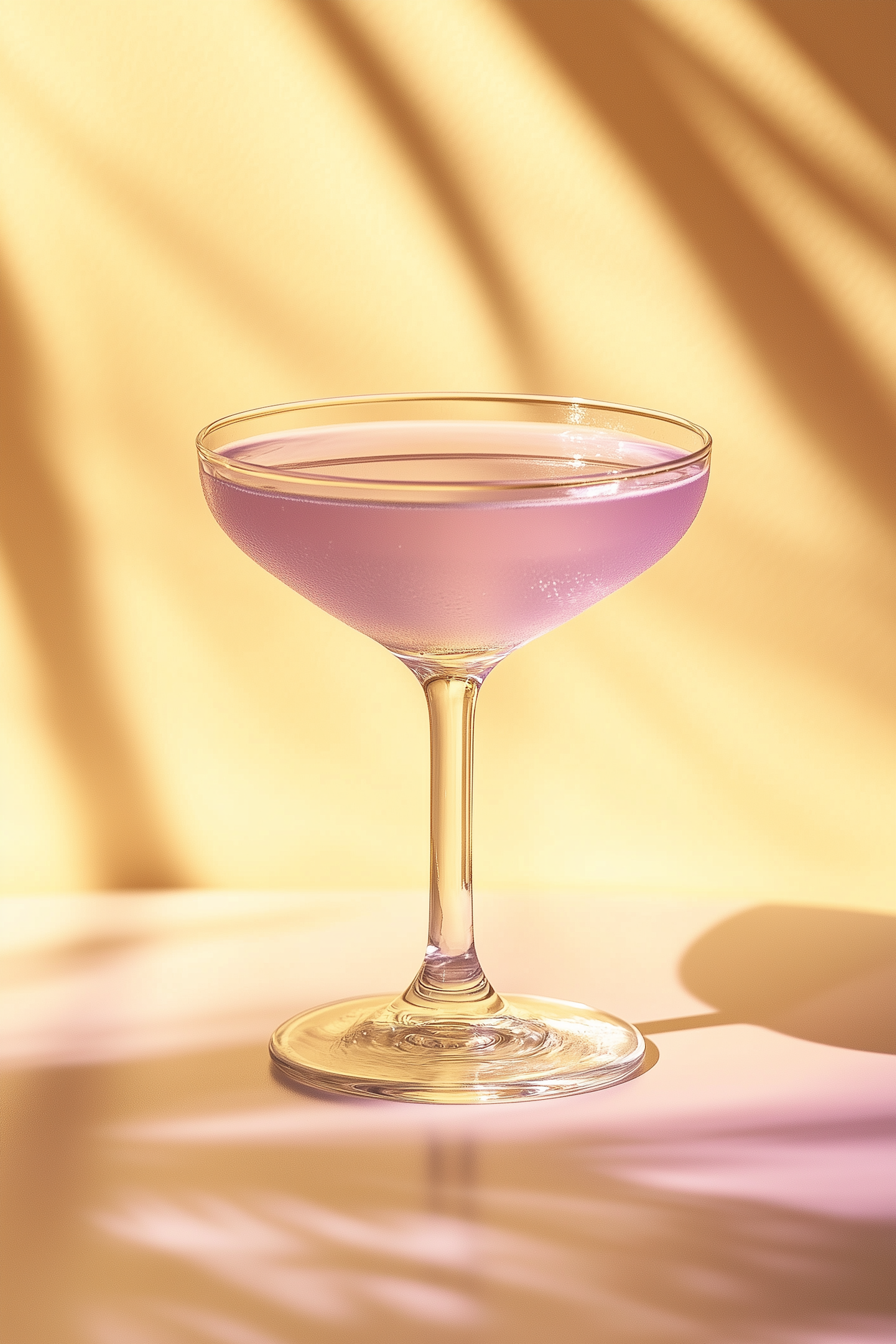 Elegant coupe glass with a light purple cocktail against a warm yellow background, creating a tropical and refreshing vibe.