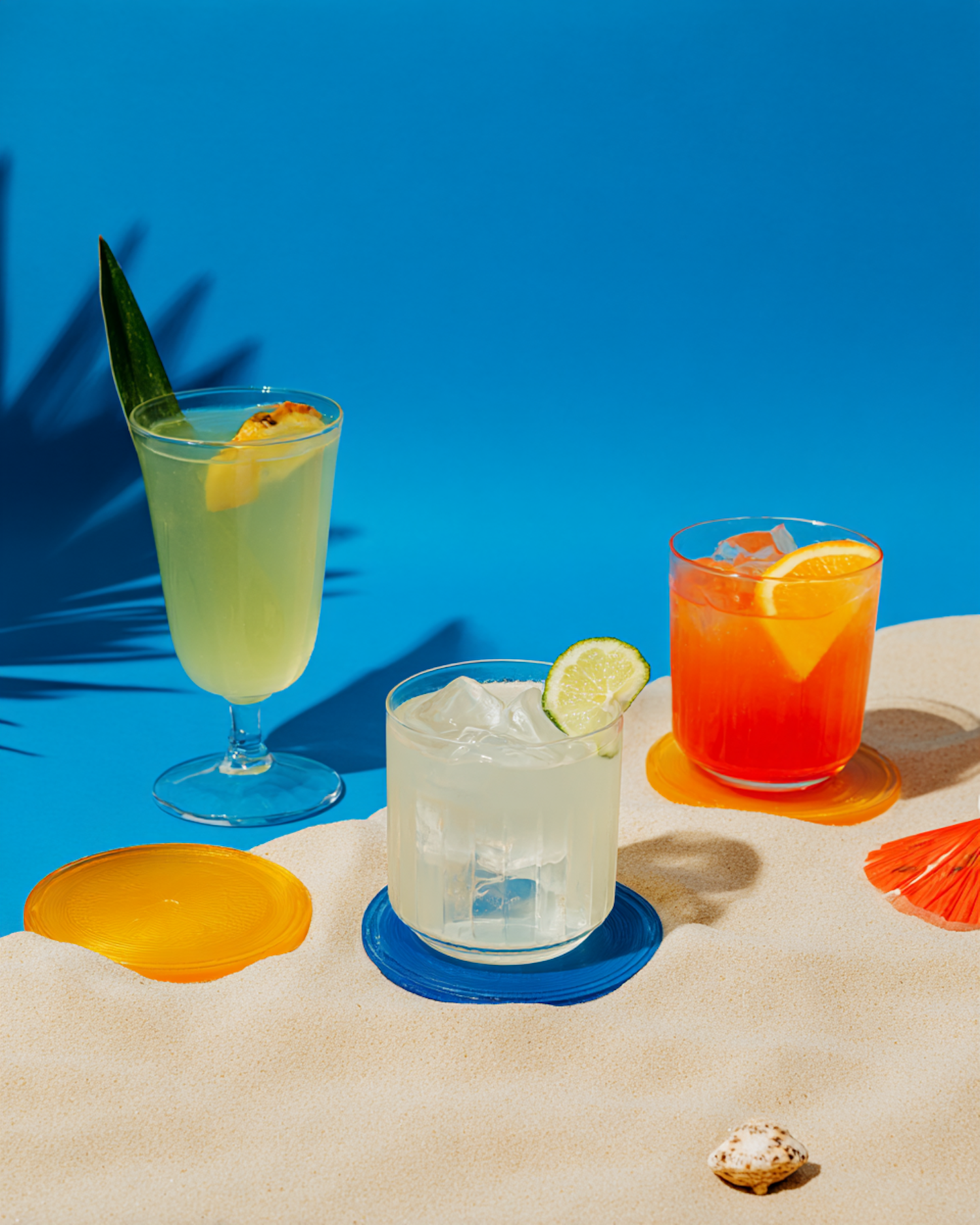Three vibrant cocktails on a sandy surface with a tropical vibe, featuring colorful garnishes and a bright blue background.