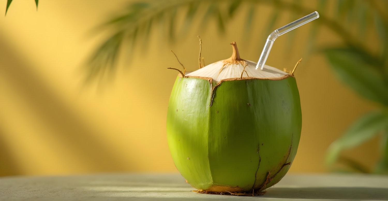 Fresh green coconut with a straw on a yellow background, evoking tropical vibes and refreshment.