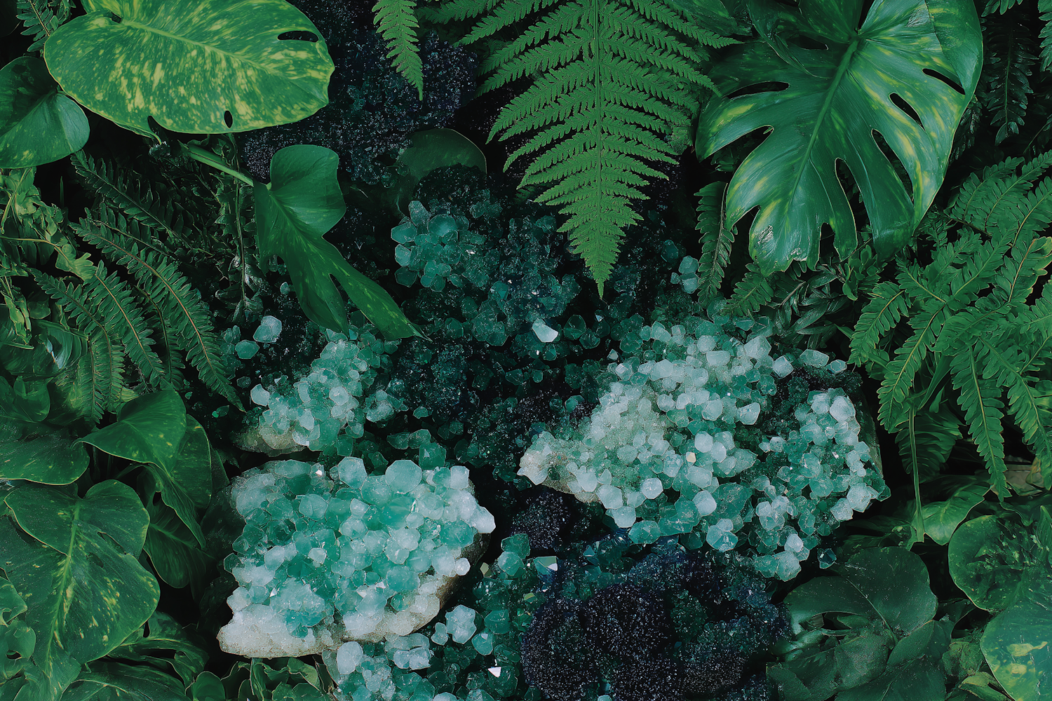 A lush arrangement of green leaves and sparkling emerald-toned green crystals create a blend of natural serenity and gemstone beauty.