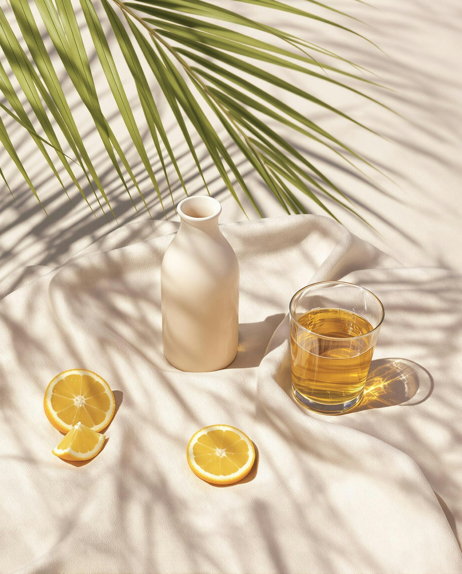 A sunlit table with a drink, lemon slices, a vase, and palm shadows creates a fresh and inviting tropical feel.