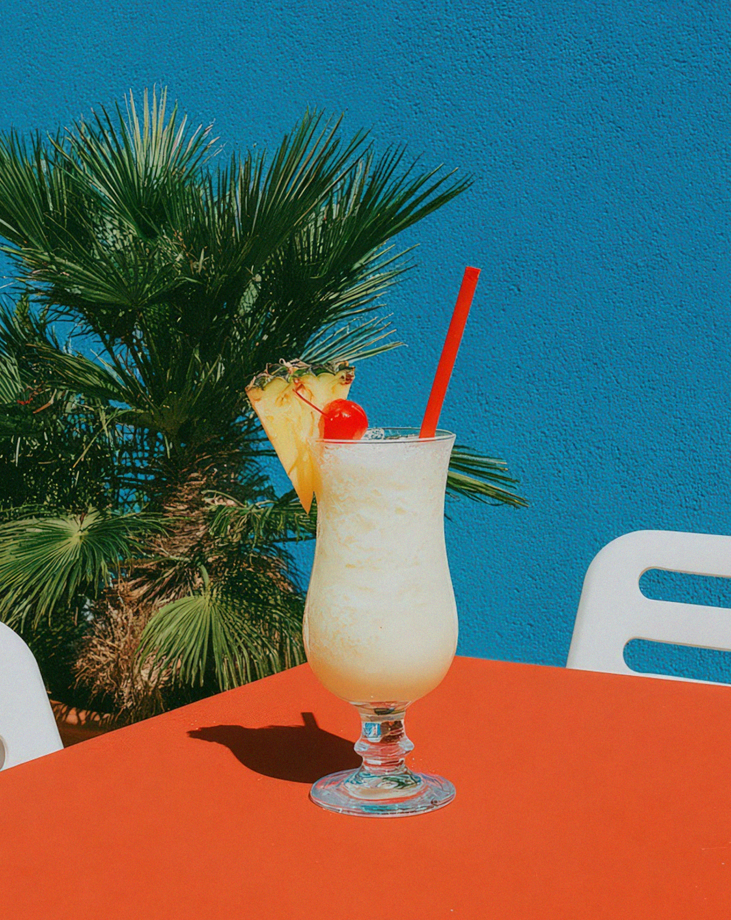 A tropical drink with pineapple and cherry garnish on a bright orange table, set against a blue wall and palm leaves. Summer vibes!