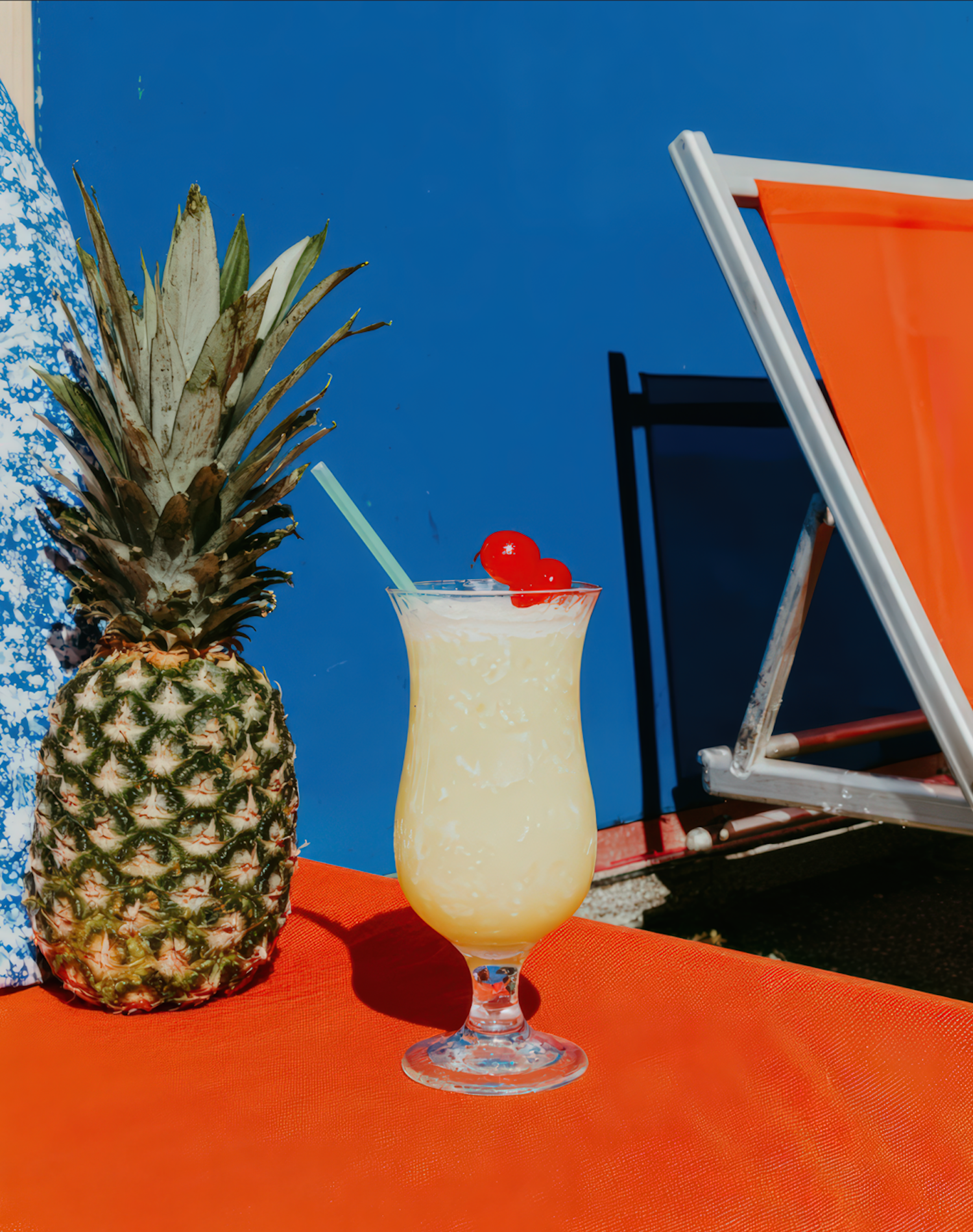 Tropical drink with cherries and a pineapple on a bright orange surface, set against a blue wall and lounge chair. Perfect summer vibes!