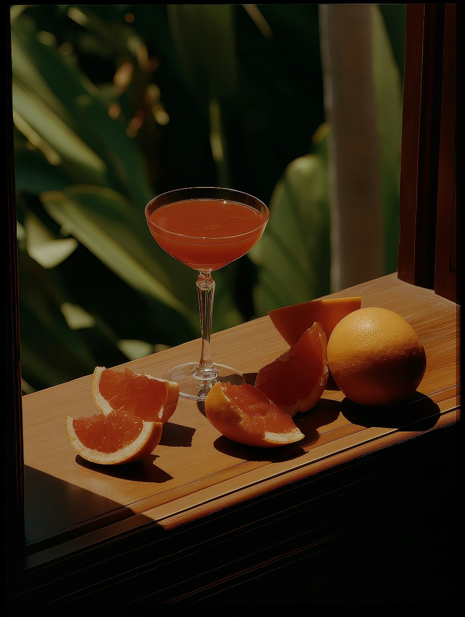 A refreshing cocktail with fresh orange and grapefruit slices on a wooden windowsill, set against a lush green tropical background.