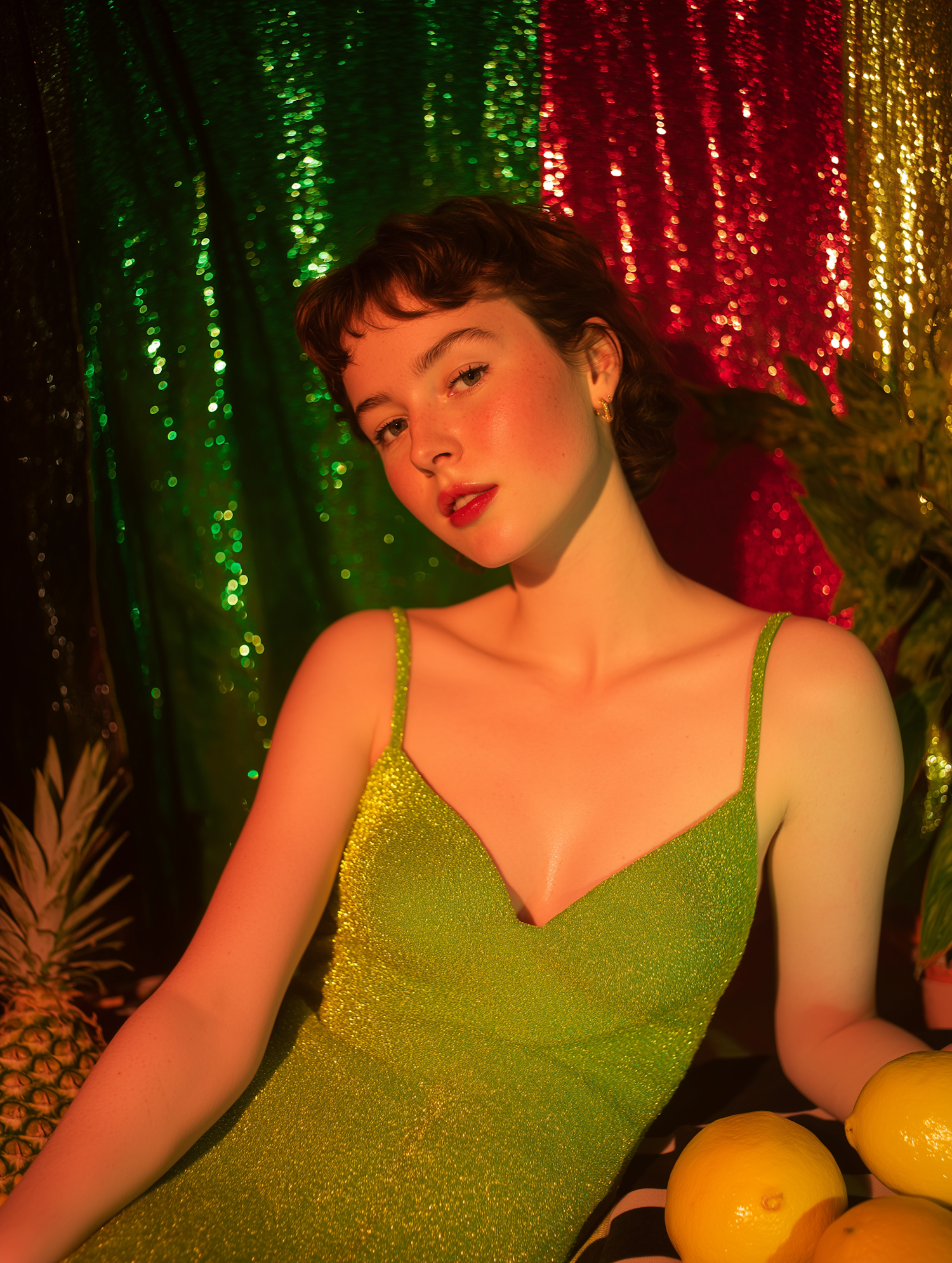 A vibrant portrait of a woman in a shimmering green dress, surrounded by tropical fruits and colorful sequined curtains.
