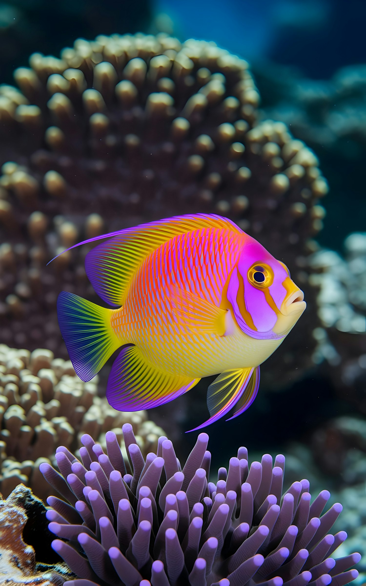Bright tropical fish with pink, yellow, and purple hues swims near purple sea anemones in a vibrant coral reef setting.