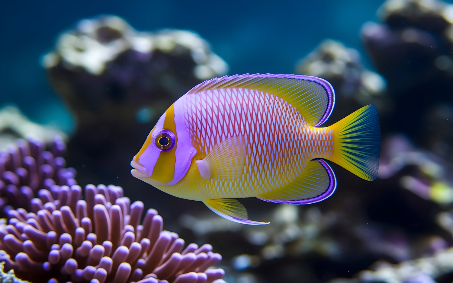 A colorful tropical fish with yellow, purple, and blue hues swims near vibrant purple coral in a serene underwater scene.