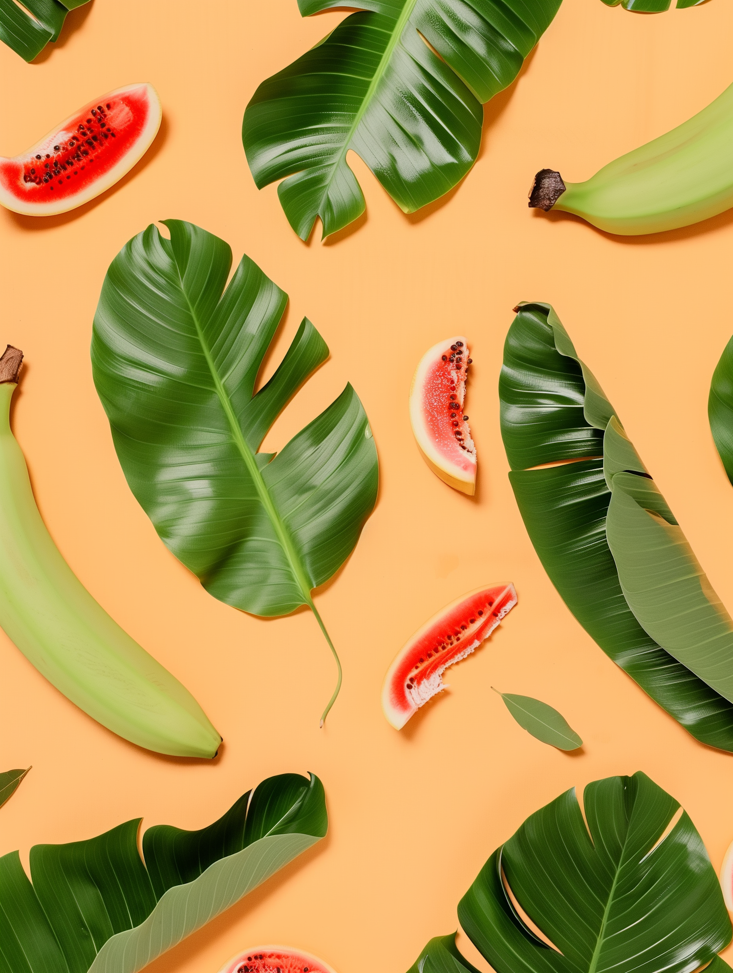 Tropical flat-lay with green banana leaves, fresh watermelon slices, and whole bananas on a warm orange background.