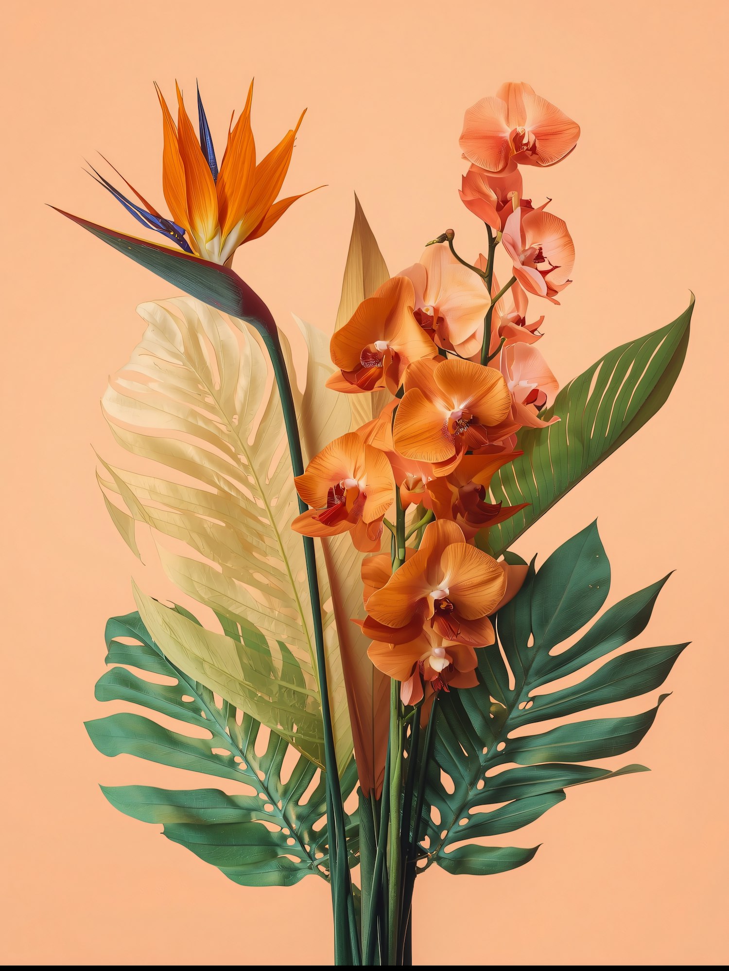 A vibrant tropical floral arrangement with orange orchids, a Bird of Paradise, and lush green leaves on a soft peach background.