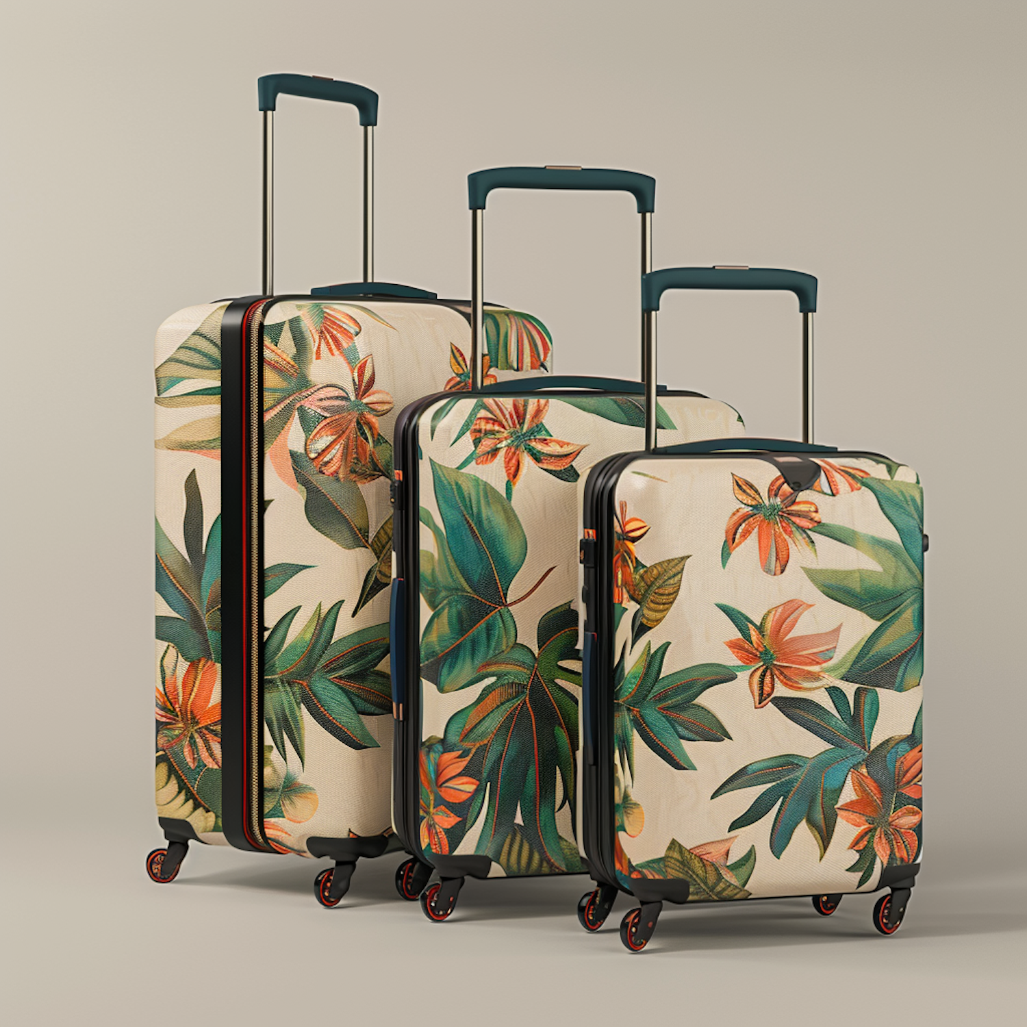Set of three tropical floral suitcases with vibrant leaf and flower patterns, featuring extendable handles and smooth-rolling wheels.