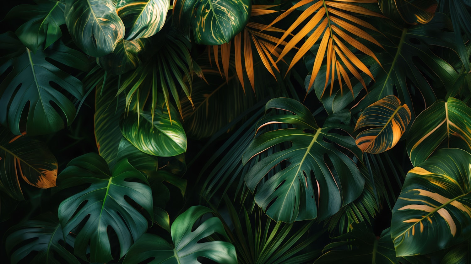 Vibrant tropical leaves with deep greens and bright yellows create a lush, exotic tapestry of foliage.