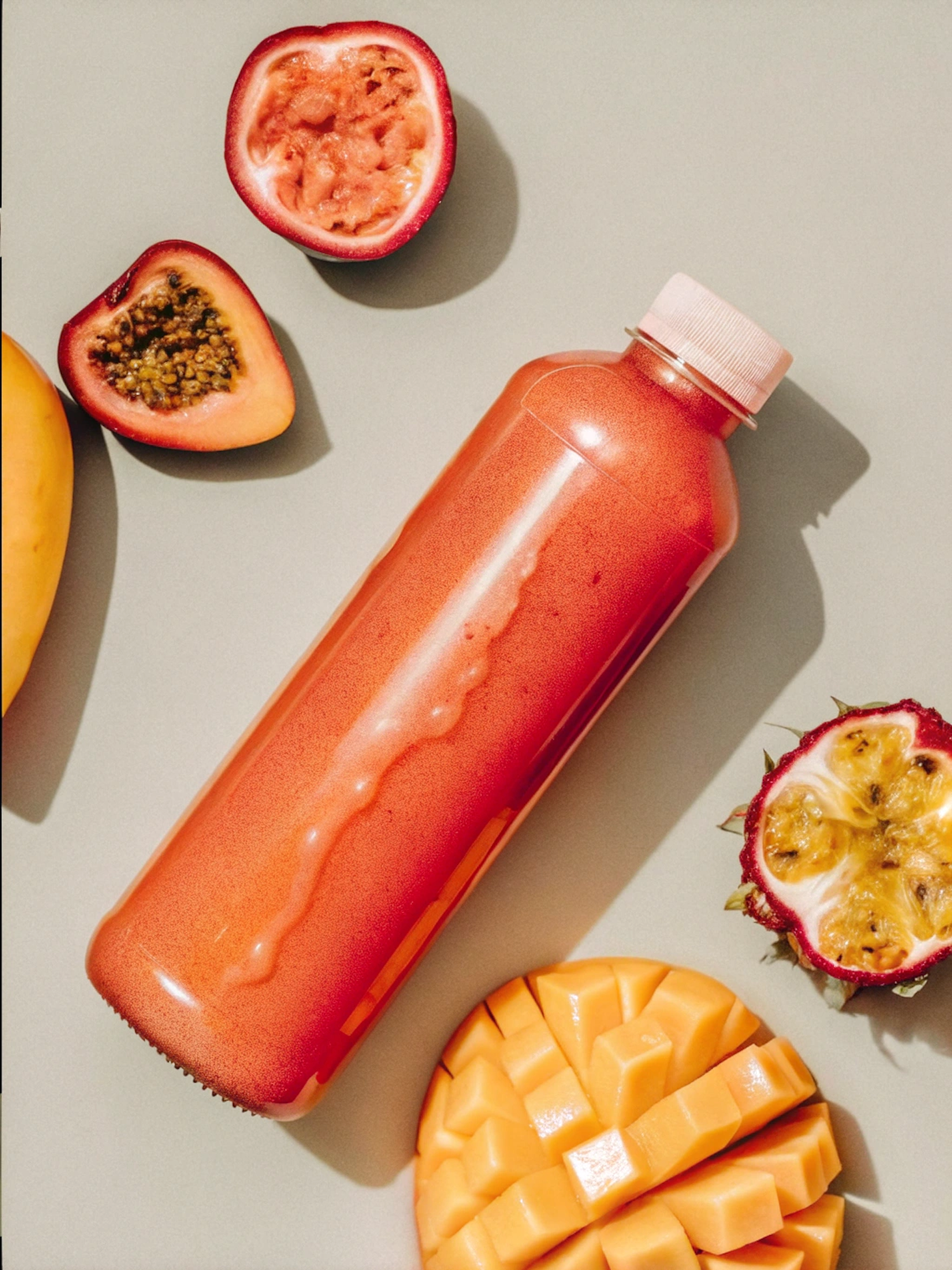 Bright tropical juice bottle surrounded by halved passion fruits and a sliced mango on a light green background. Refreshing and vibrant!