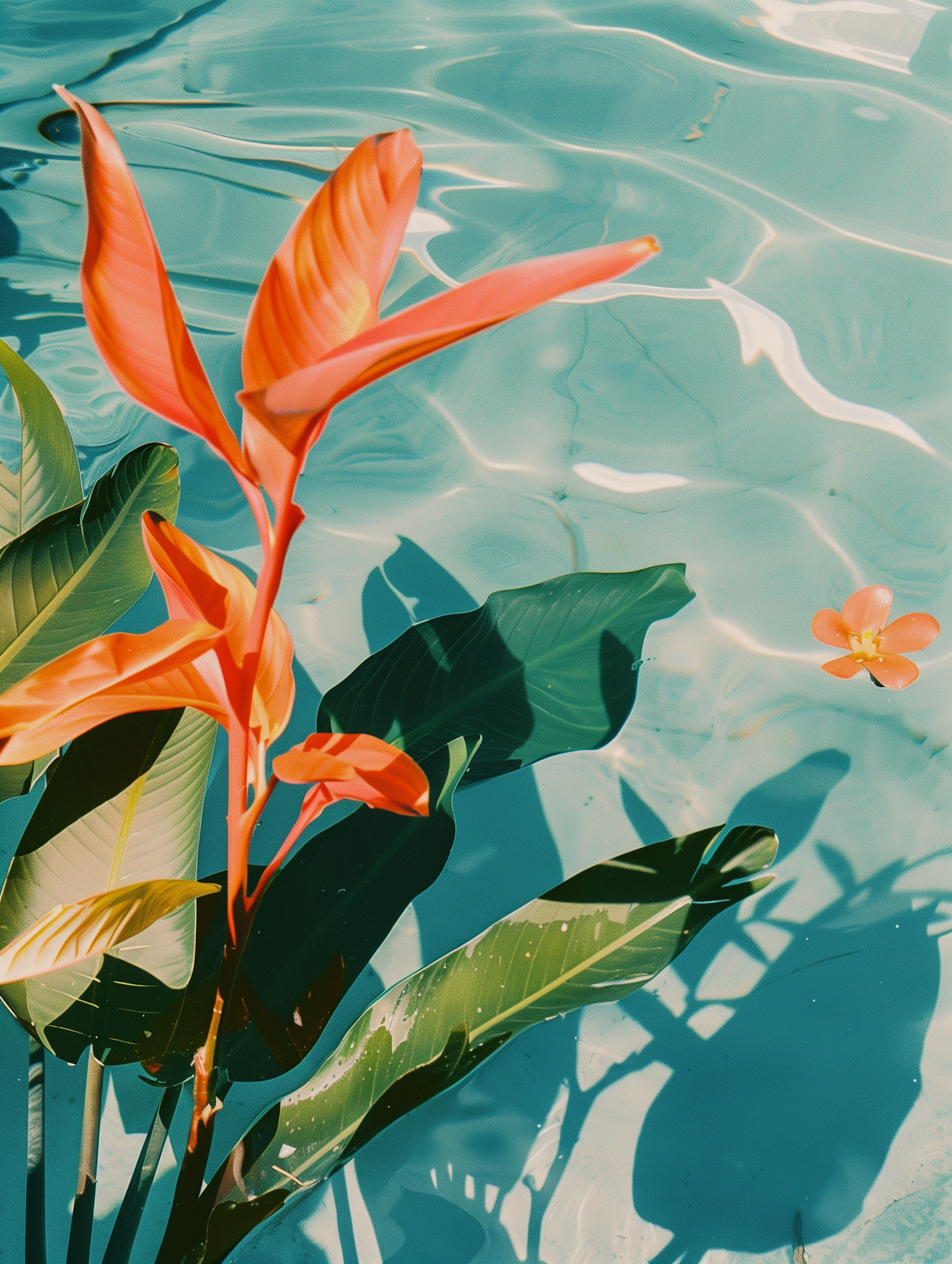 Vibrant orange tropical flowers and lush green leaves against a turquoise water background, creating a serene and refreshing scene.