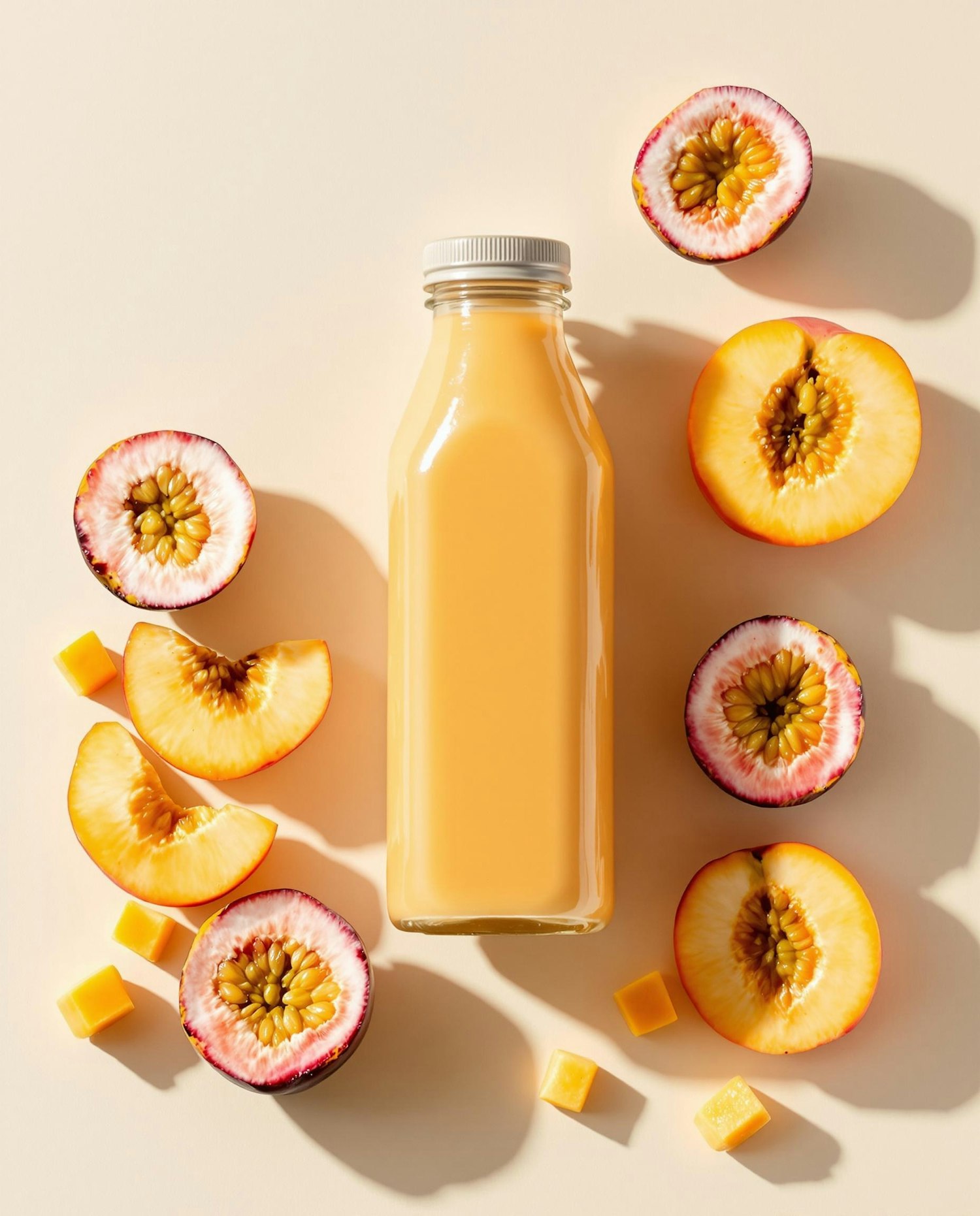 studio photography of a glass juice bottle with a beige cap, placed upright on a pale neutral background, surrounded by neatly arranged and halved fresh fruits, strong natural lighting with soft shadows, clean and aesthetic flat lay composition, minimal yet vibrant look, containing a pastel orange smoothie, surrounded by halved peaches, sliced passion fruits with visible seeds, and small peach cubes